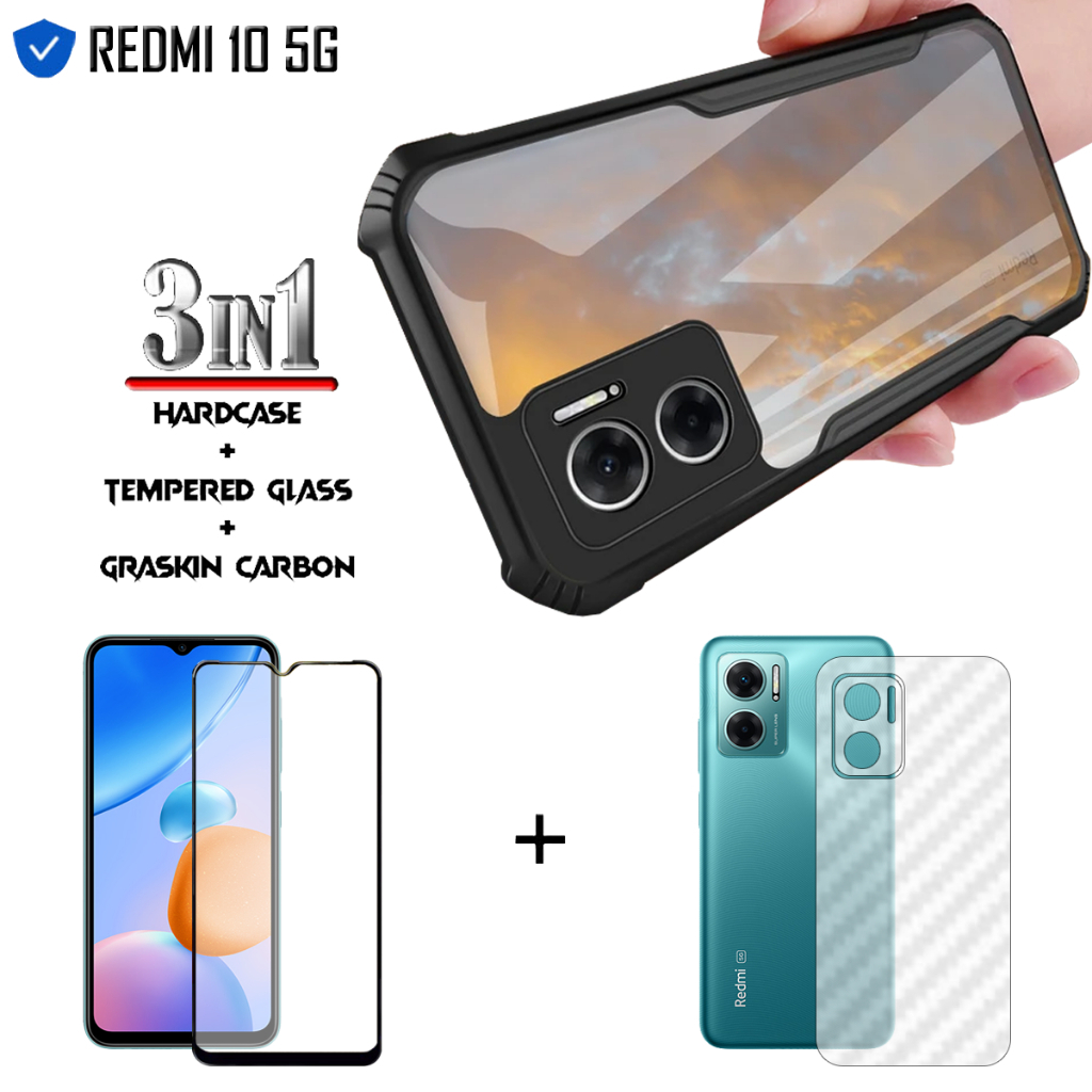 Paket 3 in 1 Redmi 10 5G Hardcase Transparan + Anti Gores Kaca + Garskin