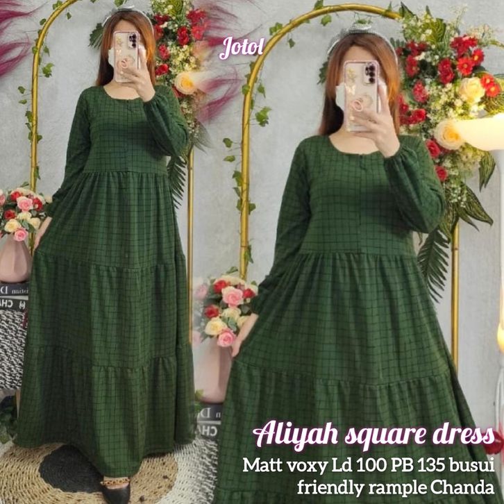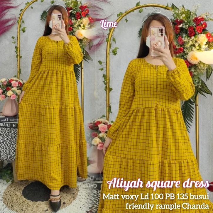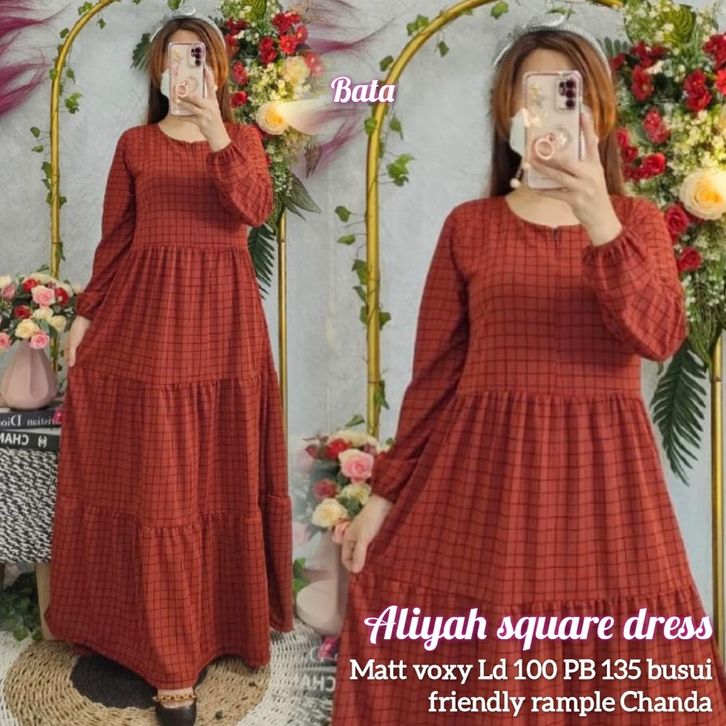 Dress Square Aliyah Gamis Motif Kotak Pakaian Muslimah Lengan Panjang Wanita Kekinian Bahan Voxy Premium Trendy