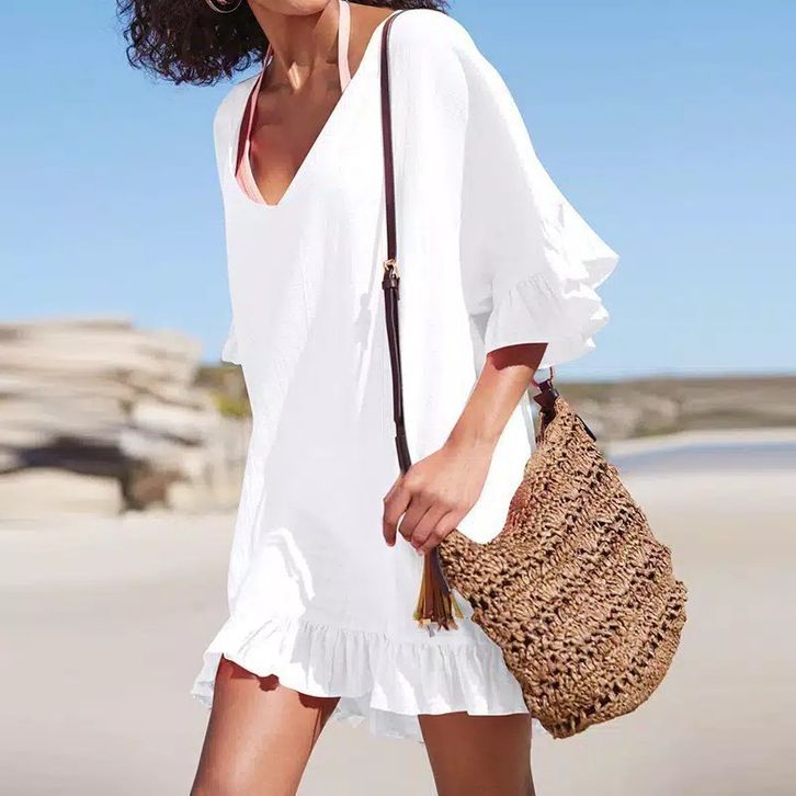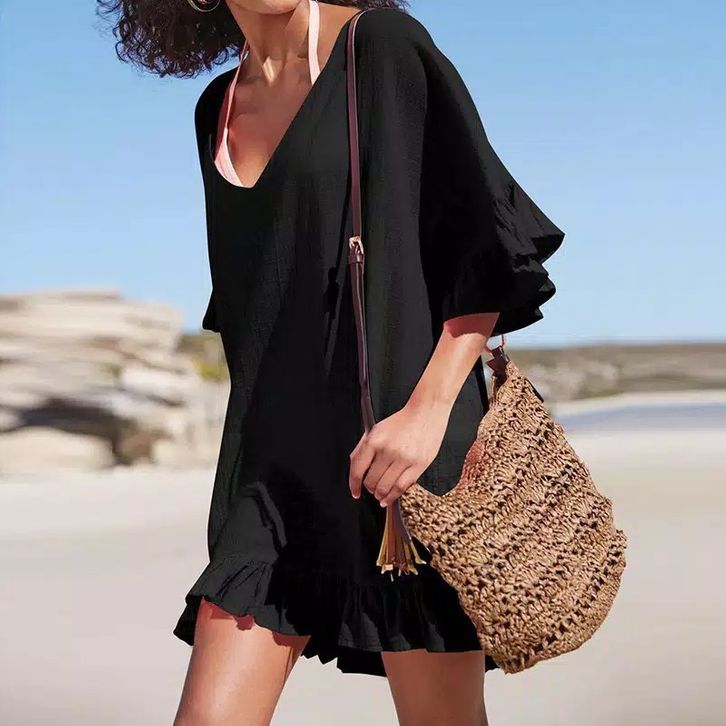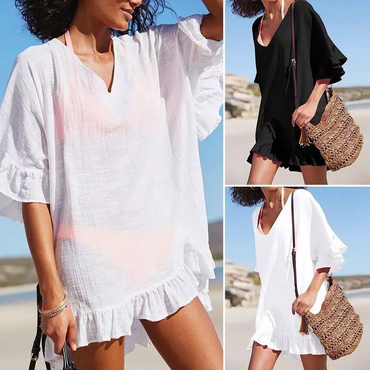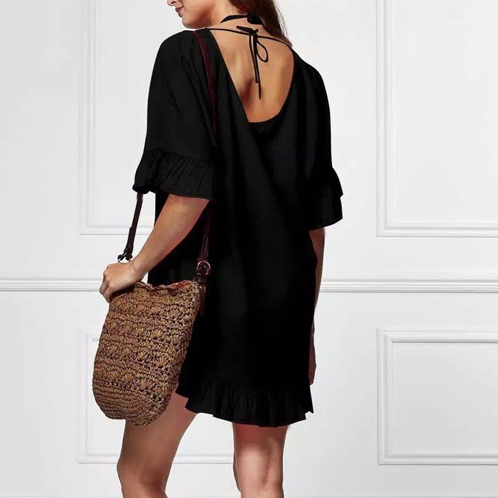Dress Pantai Wanita Big Size Bikini Cover Outer Jumbo LD 130 Oversize Ruffle Lengan Pendek Hitam Putih Black White Besa