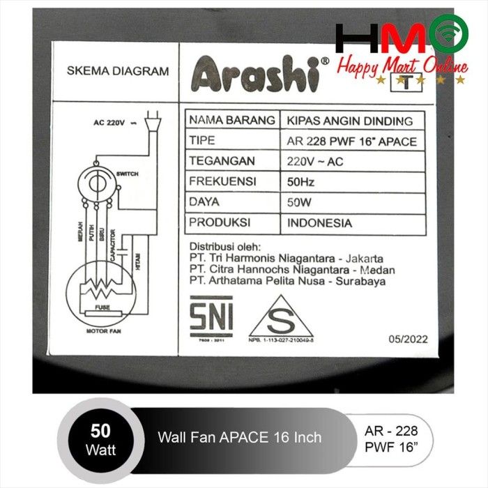 Kipas Angin Dinding 16 Inch 5 Baling Arashi Apace AR-228 PWF 16