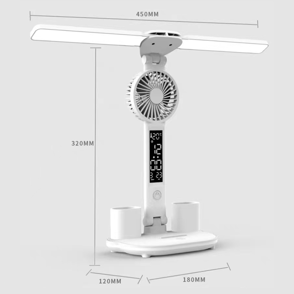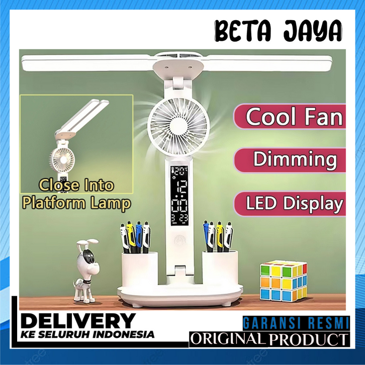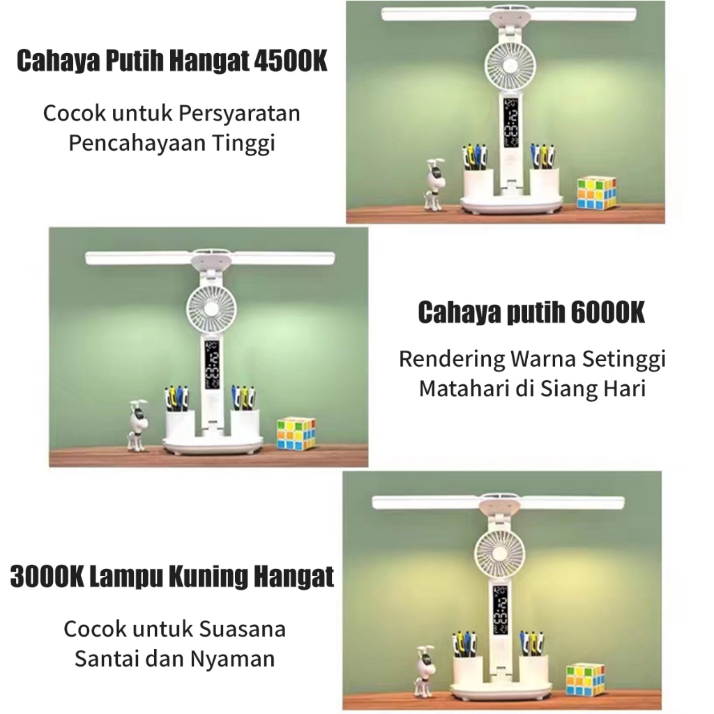 LAMPU MEJA BELAJAR MULTIFUNGSI 3 IN 1 LIPAT EMPAT KEPALA DENGAN KIPAS