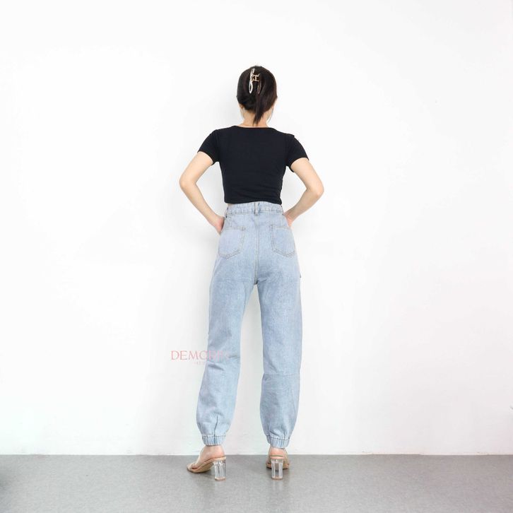 Celana Jeans Bawahan Wanita Joger Highwaist Kaki Karet Plain Blue Polos Biru X75 JESSY