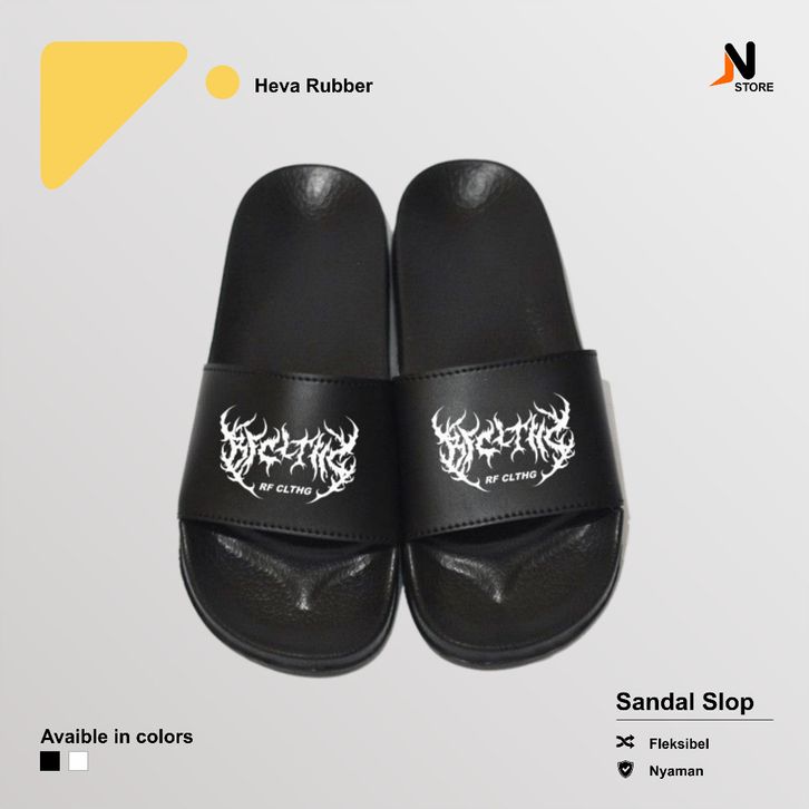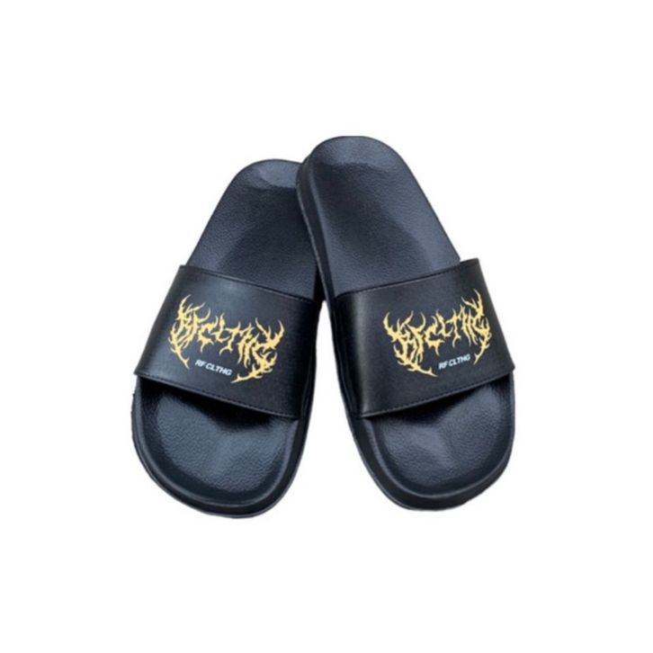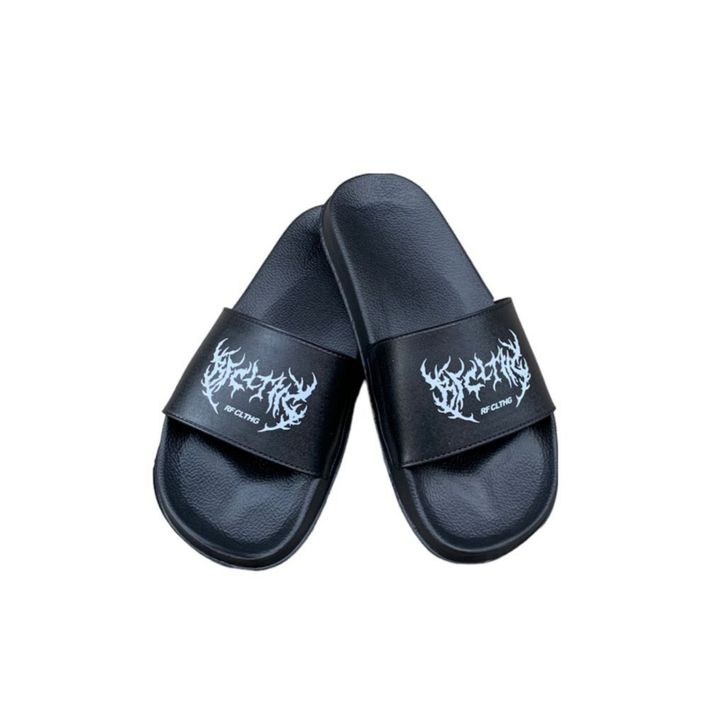 Sandal Selop Pria Wanita Hitam Print Tulisan Sendal Slip On Selide Distro Kasual Santai Upper Karet Anti Slip