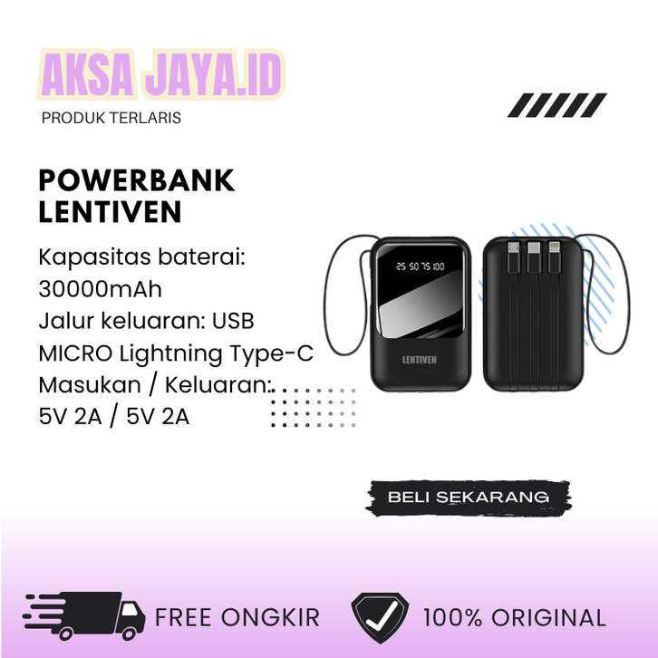 POWERBANK FAST CHARGING ORIGINAL PUNING LENTIVEN 30000MAH MINI WITH 4 USB ORIGINAL EXTERNAL PORTABLE PHONE TERLARIS