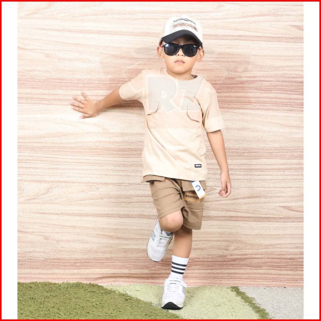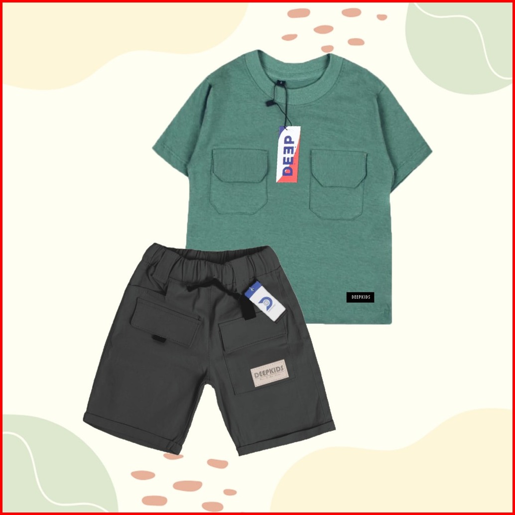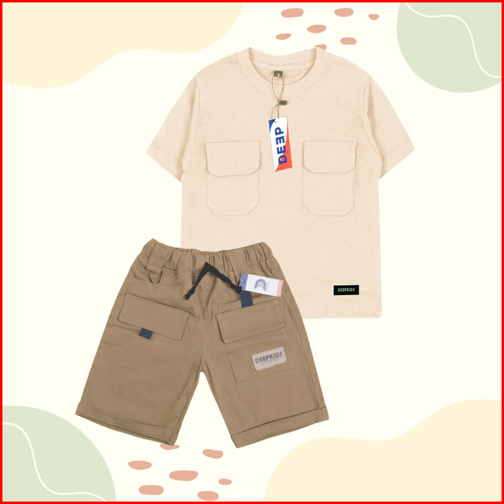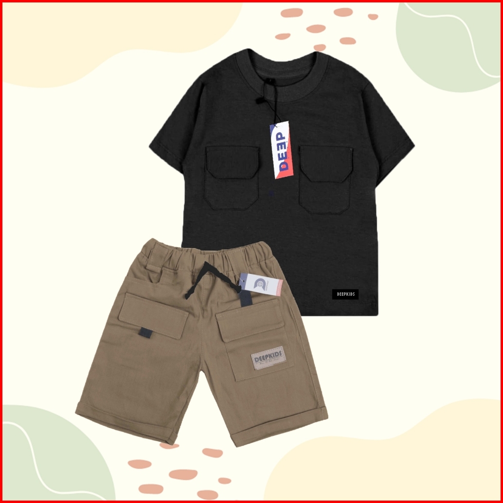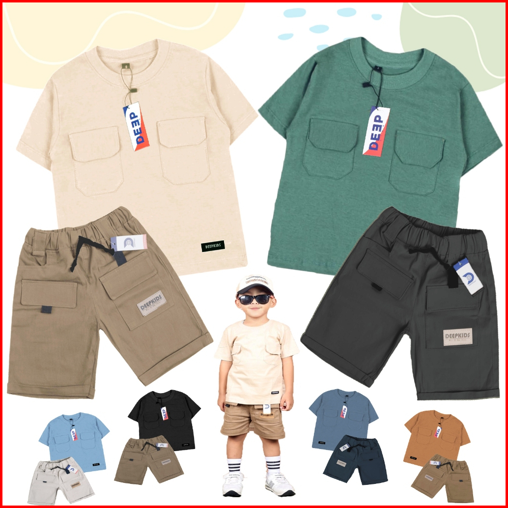 Setelan Anak Laki Laki Kaos Polos Pocket Celana Cargo Pendek Usia 1-12 Tahun Set Double Pocket Series