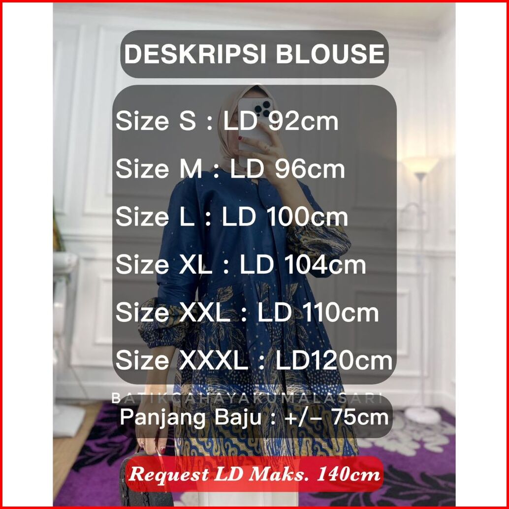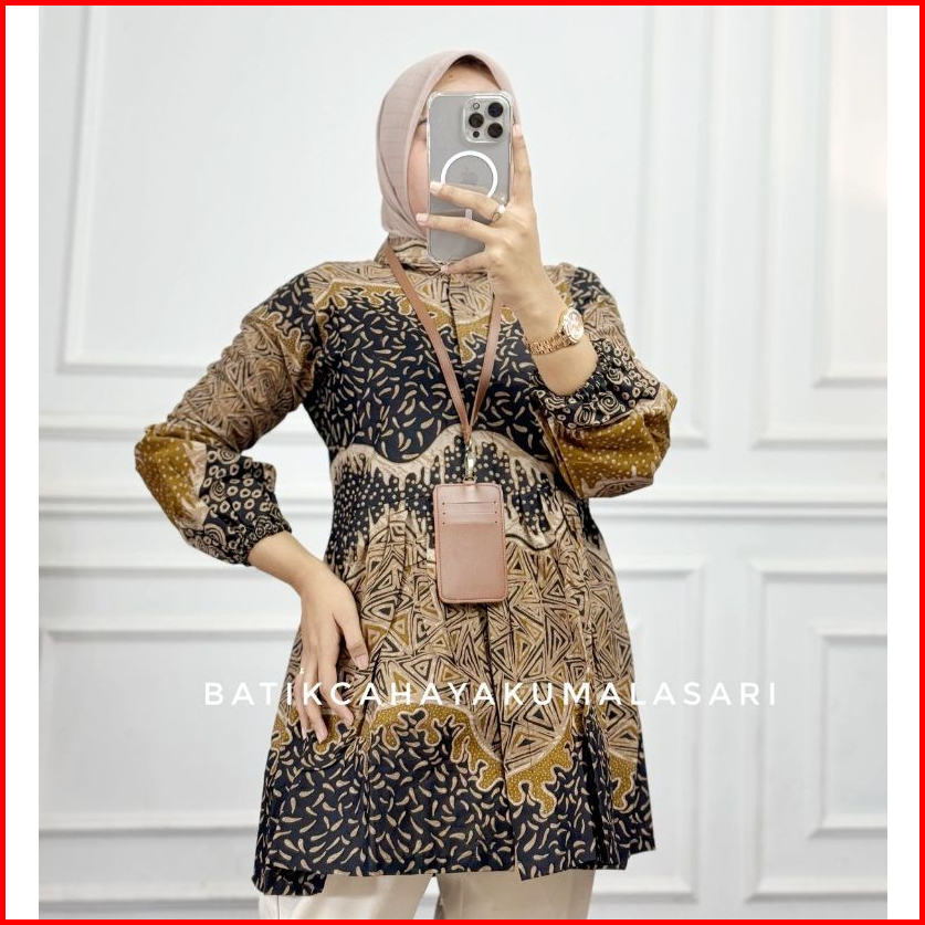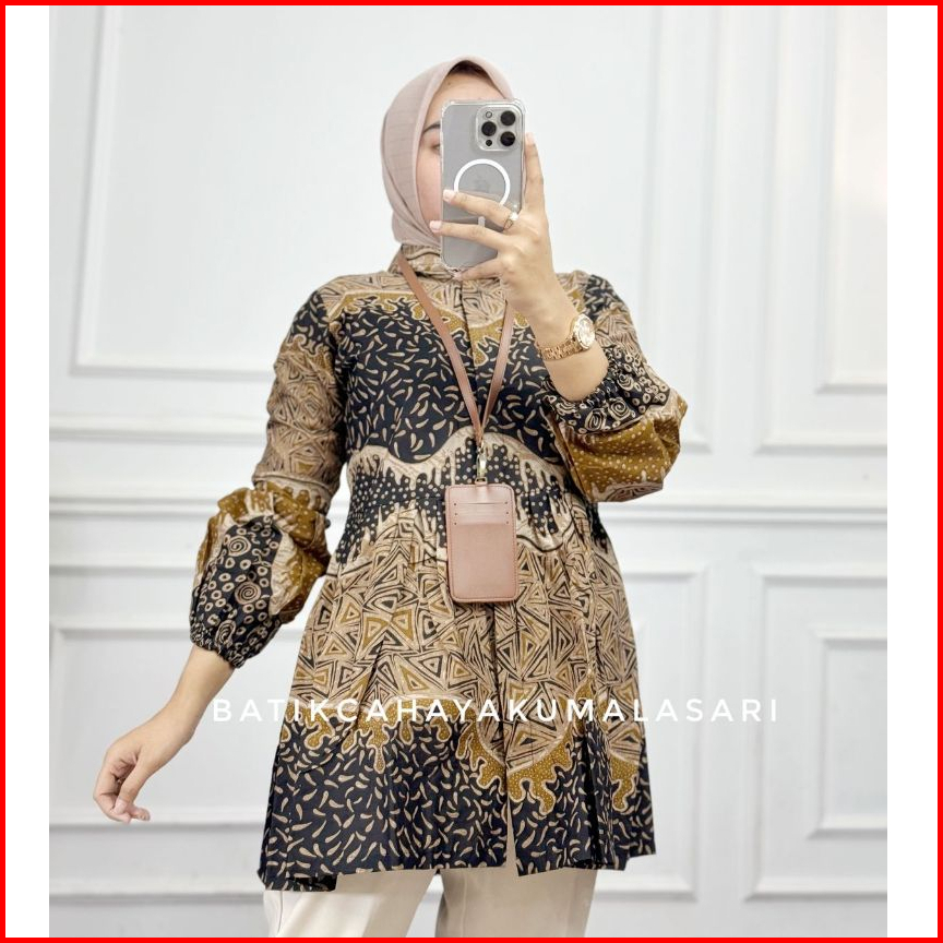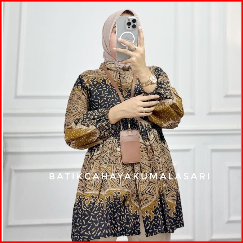 Blouse Batik Wanita Lengan Balon Medina Coklat - Atasan Kerja Wanita Bahan Katun - Blouse Kantor Wanita