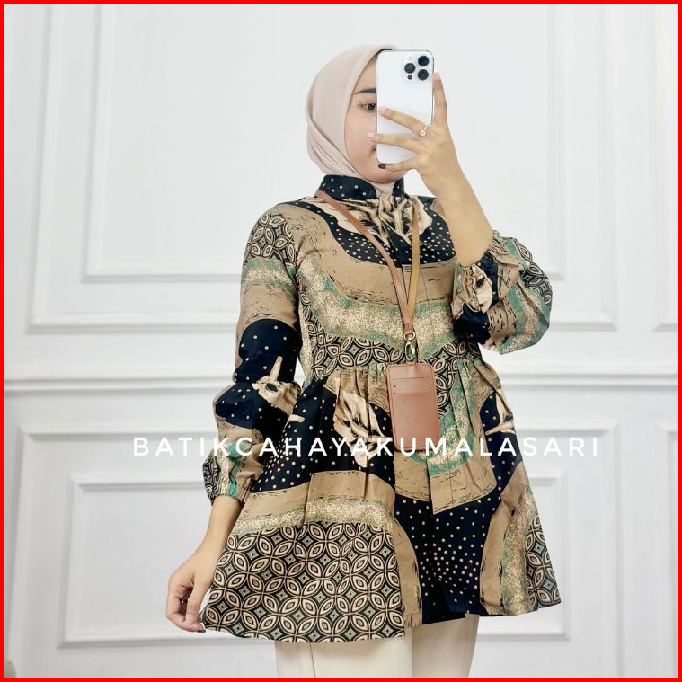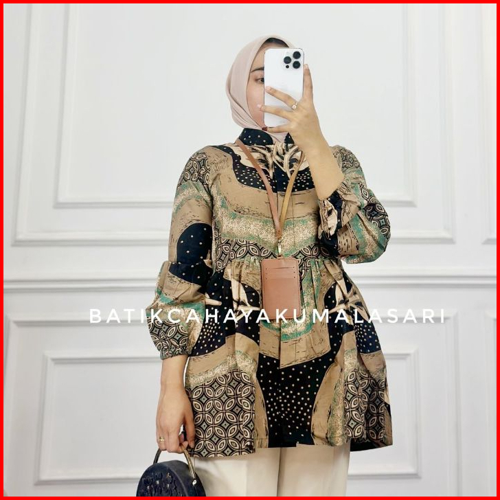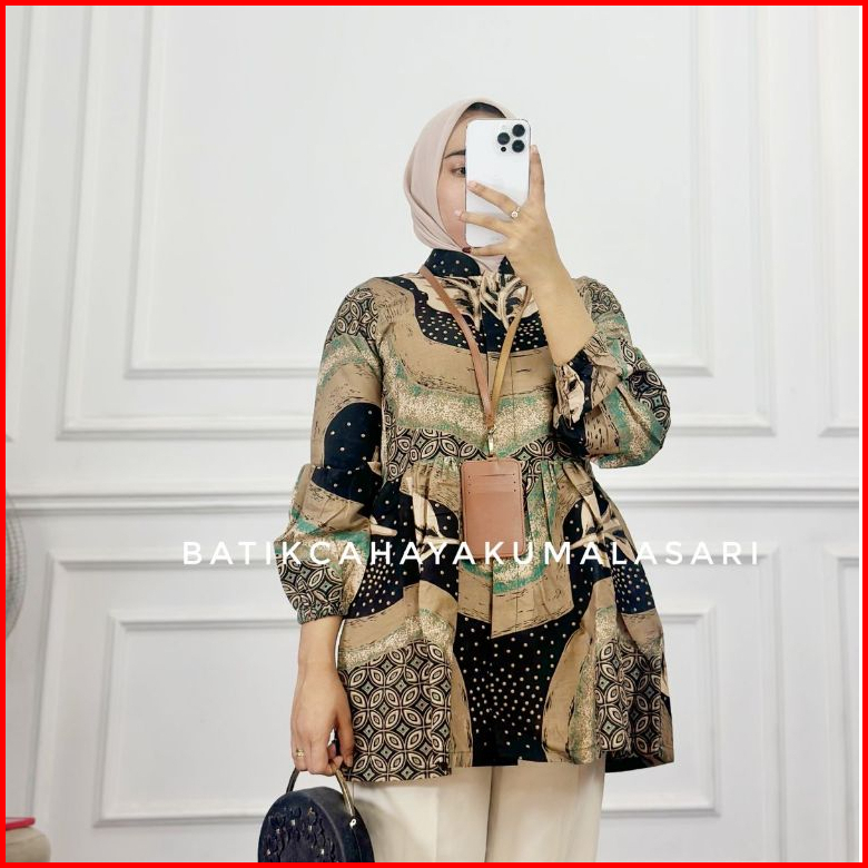Blouse Wanita Lengan Balon Motif Arruna Hitam - Batik Kantor Wanita - Batik Wanita Modern