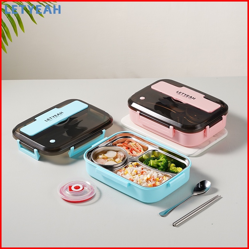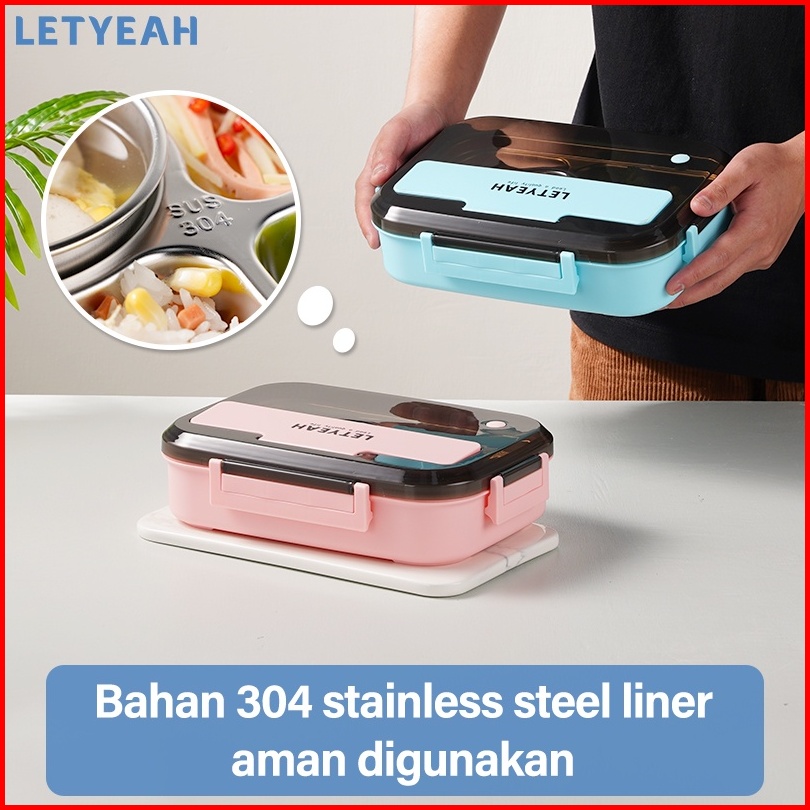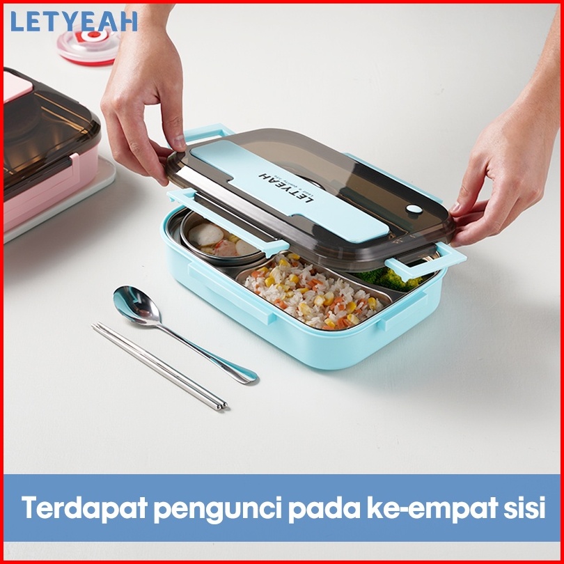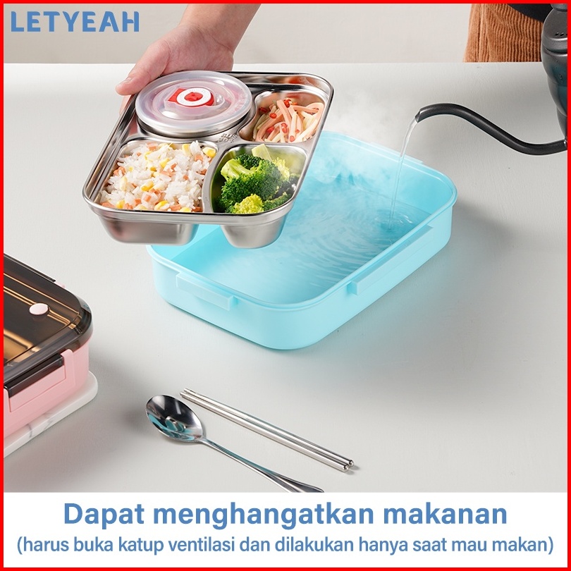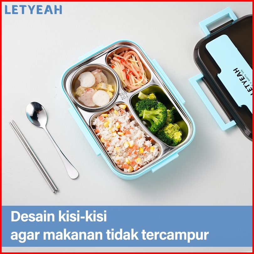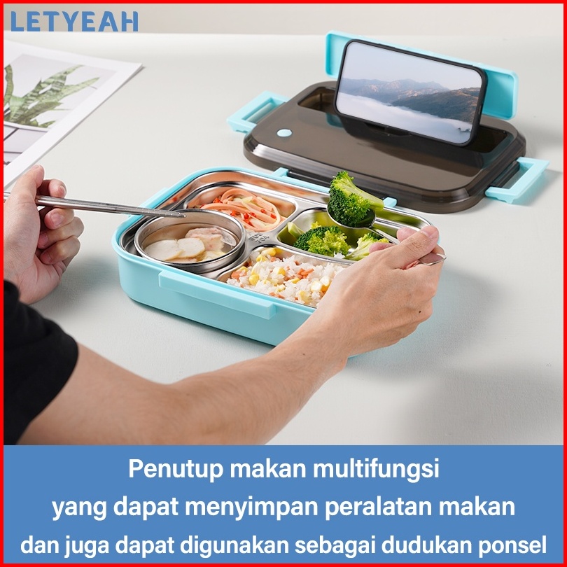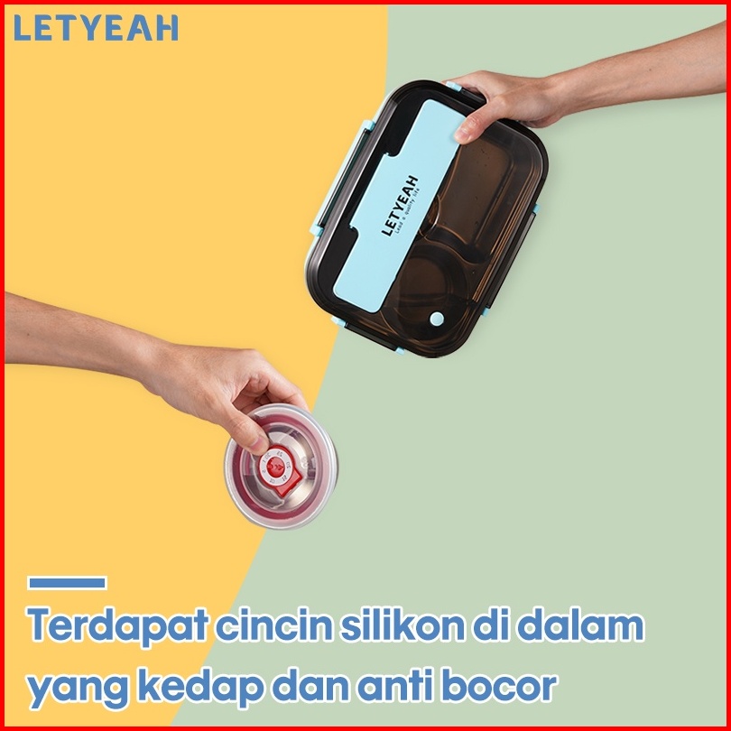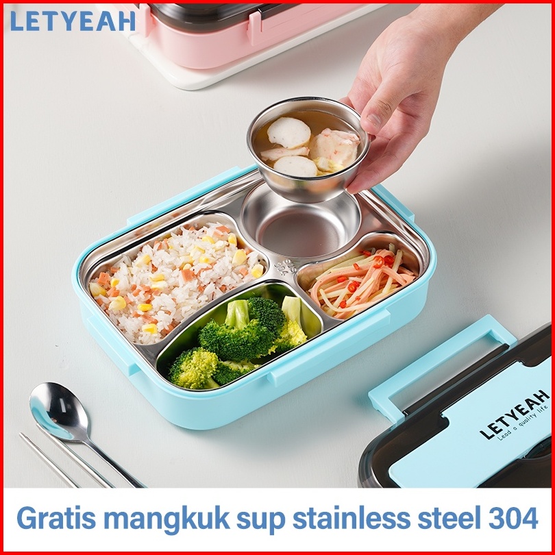 Letyeah 1300ml Kotak Makan 4 Sekat Anti Tumpah Lunch Box Stainless Dengan Mangkuk Sup