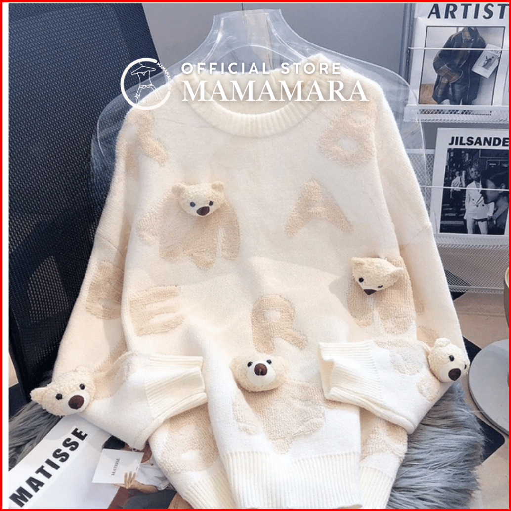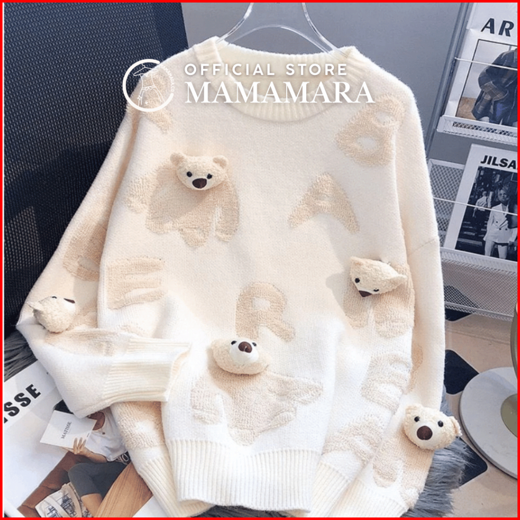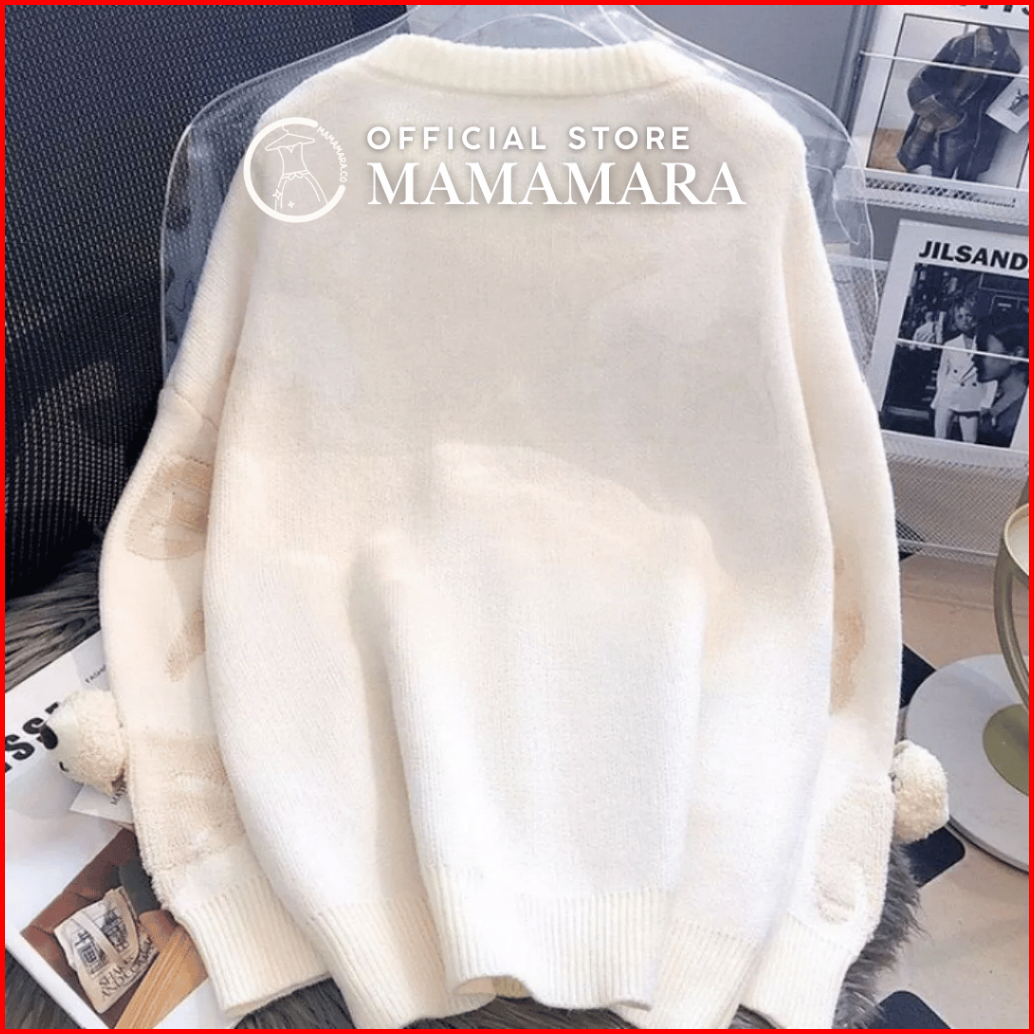 Mamamara - Cardigan Bear Beruang Imut Wol Santai Crew Neck Bunga Setrip Hitam Putih Lembut Oversize
