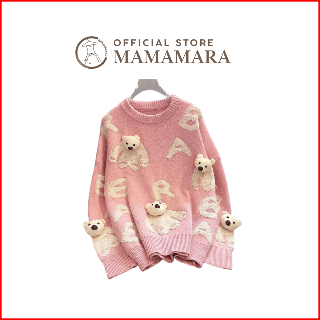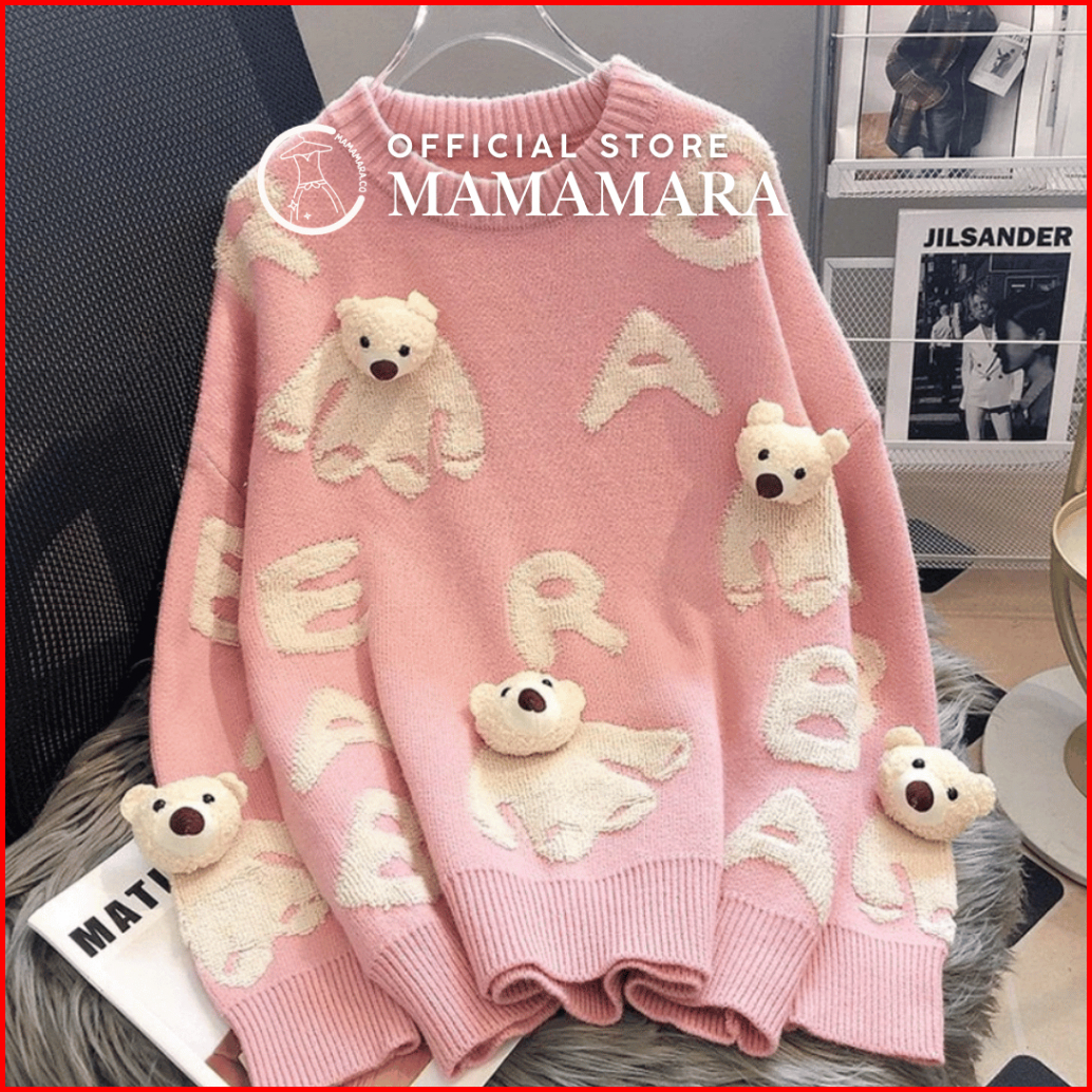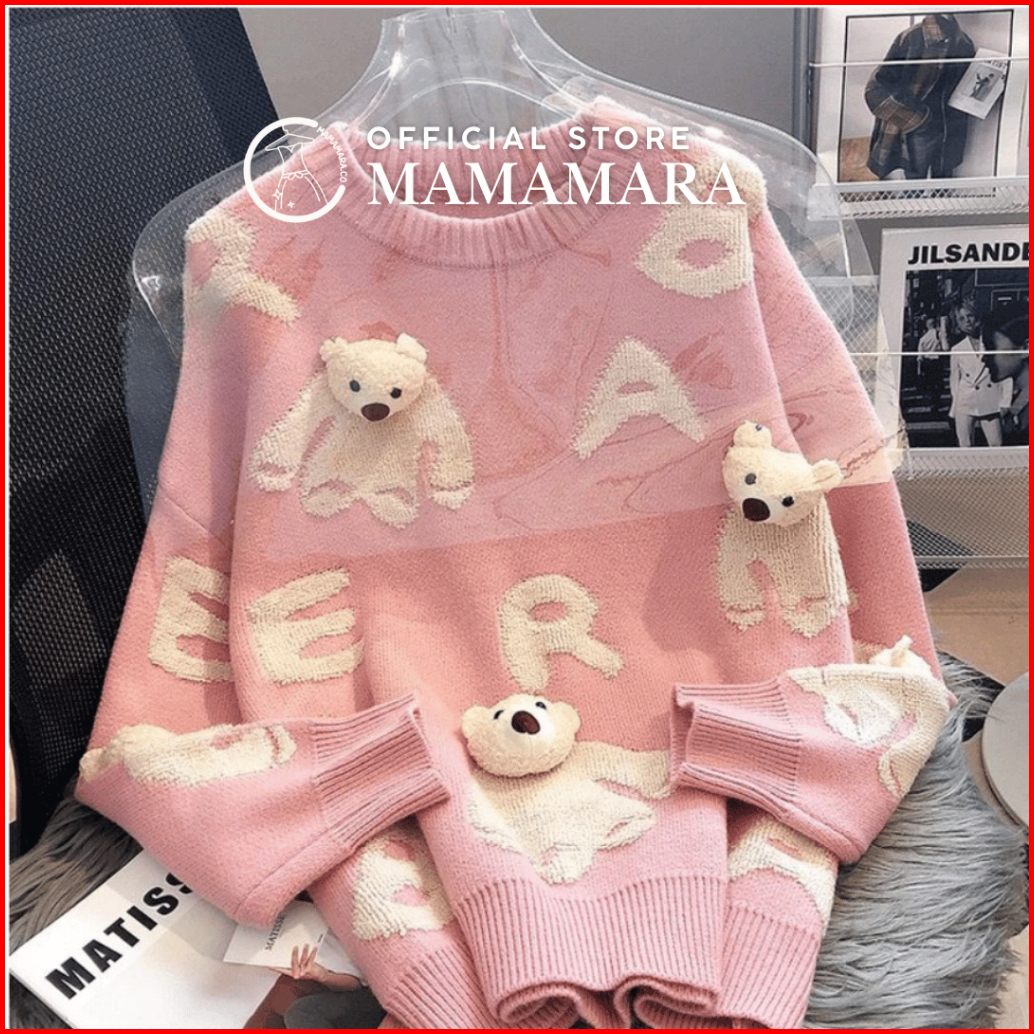 Mamamara - Cardigan Bear Beruang Imut Wol Santai Crew Neck Bunga Setrip Hitam Putih Lembut Oversize