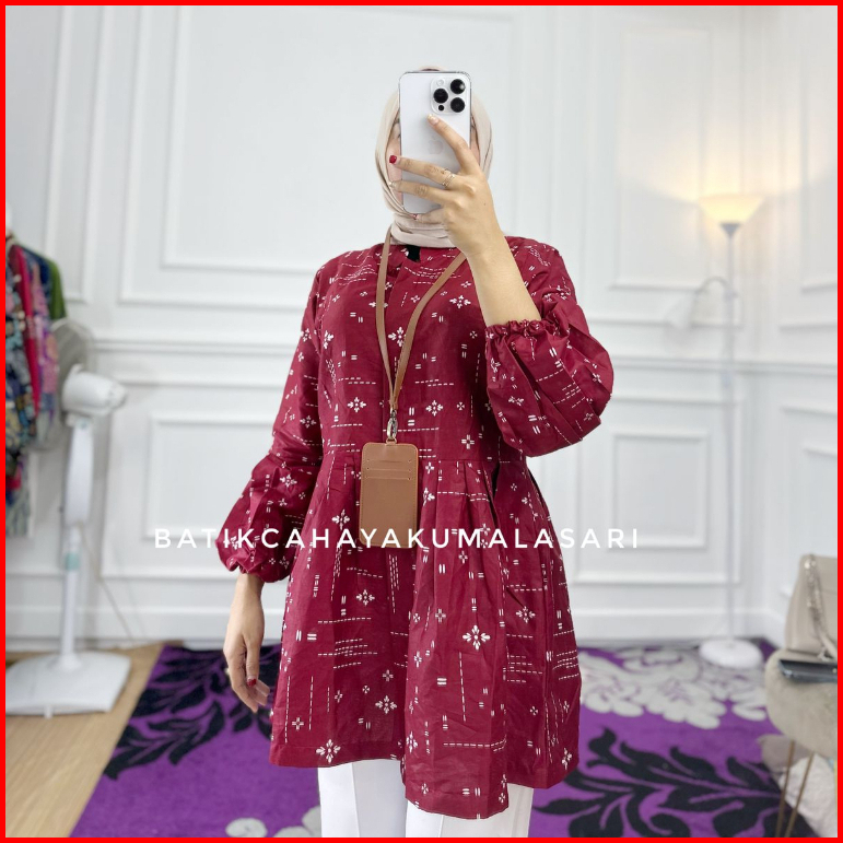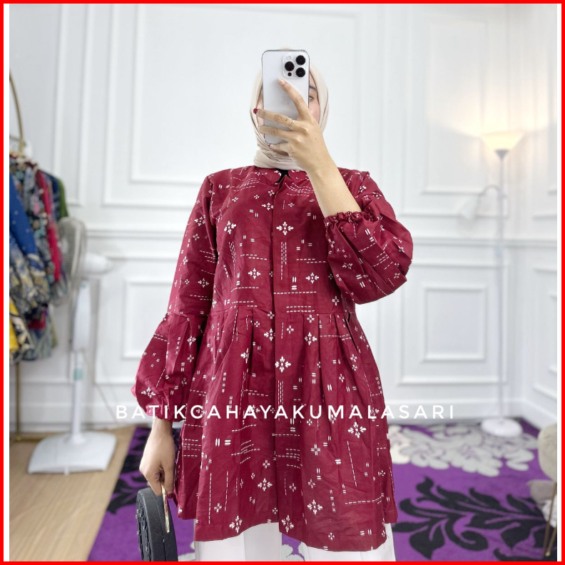 Blouse Batik Wanita Lengan Balon Motif Rintik Kasmaran Merah - Bahan Katun Prima Premium