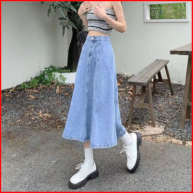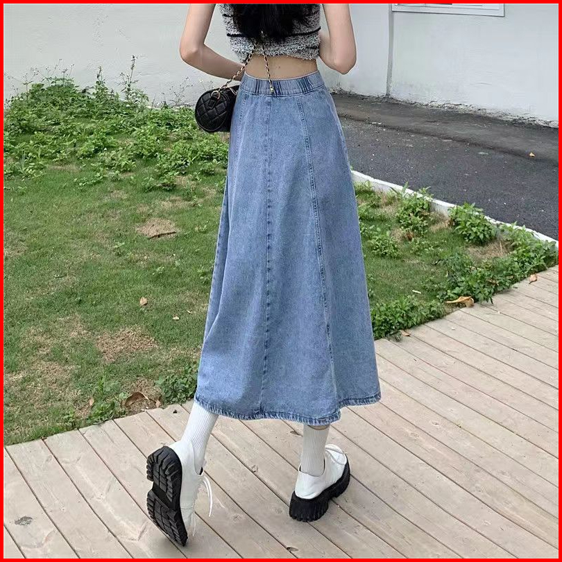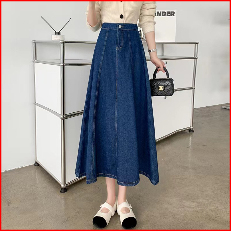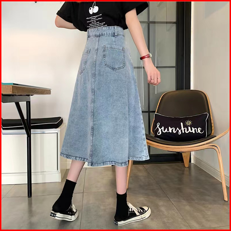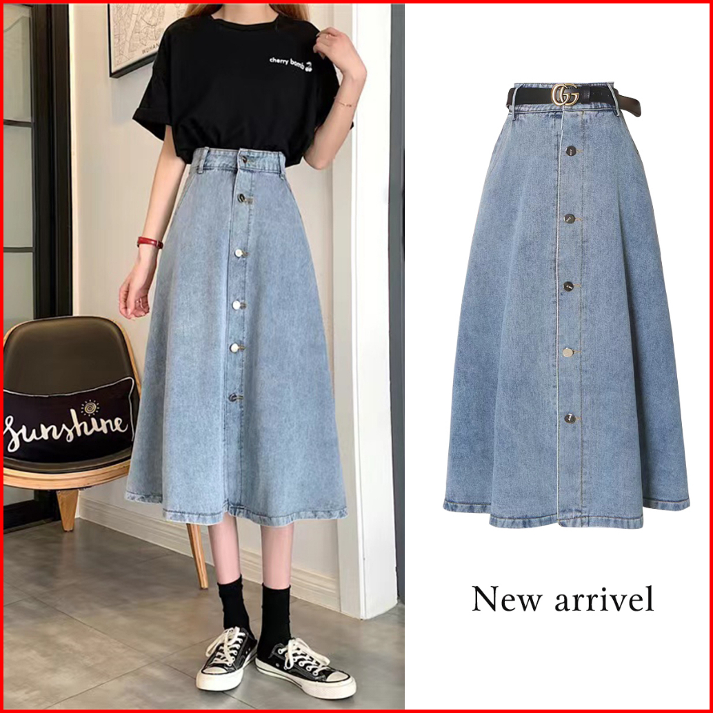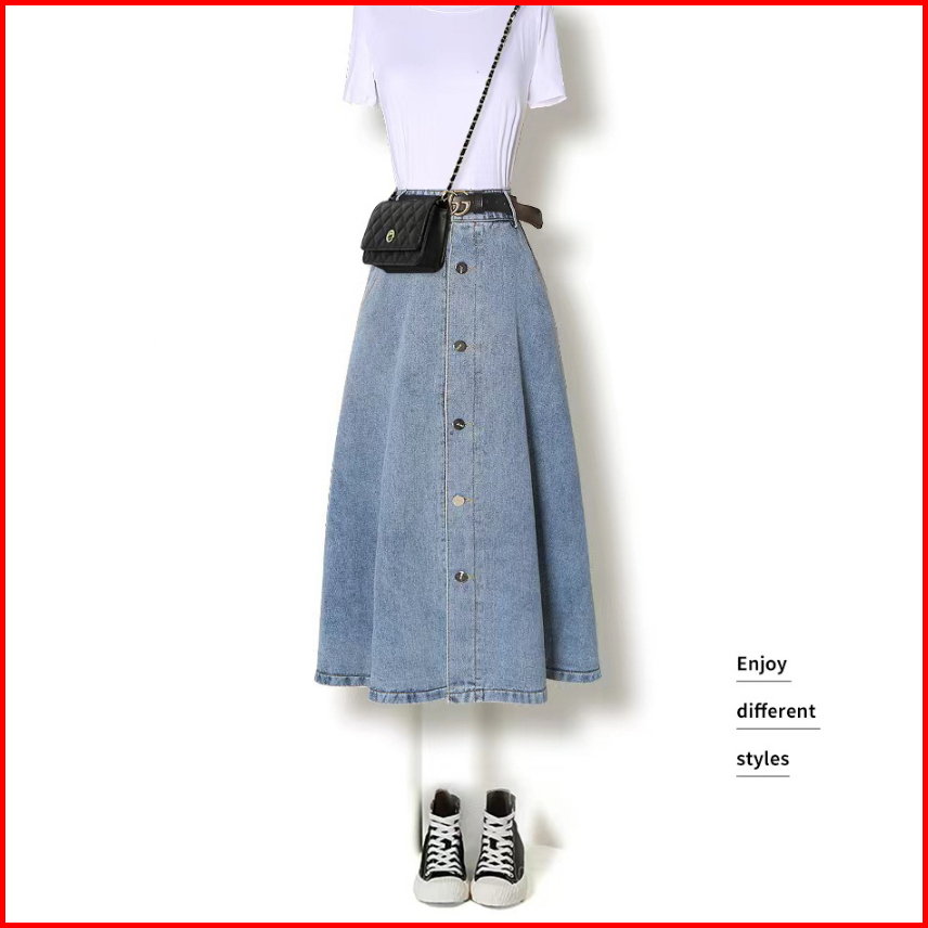 Wanita Idrok Kancing Rok Plisket Rok Korean Style Rok Midi Rok Denim Panjang Rok High Waist Rok Jumbo
