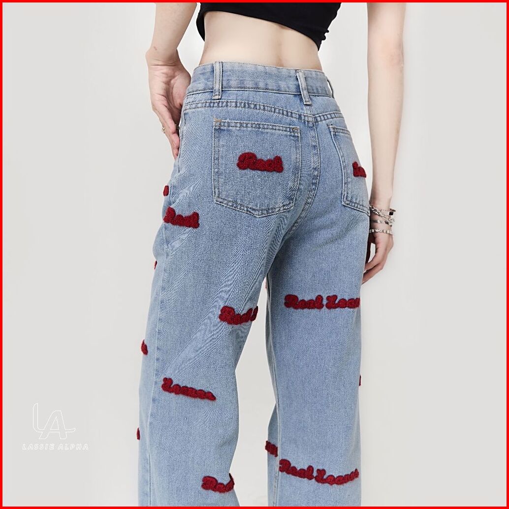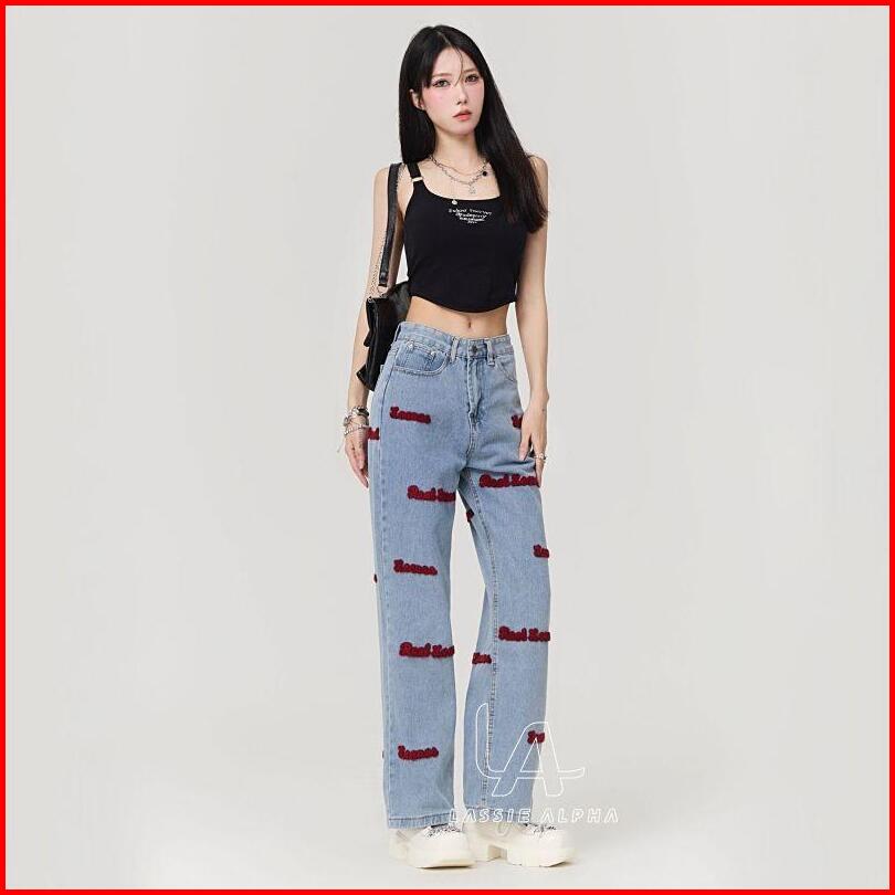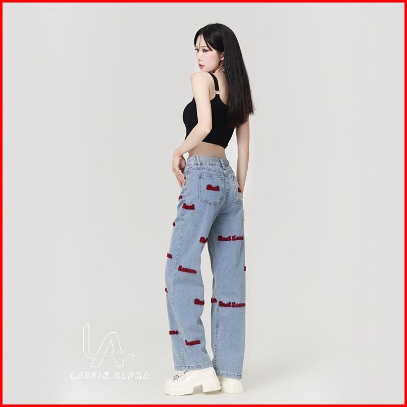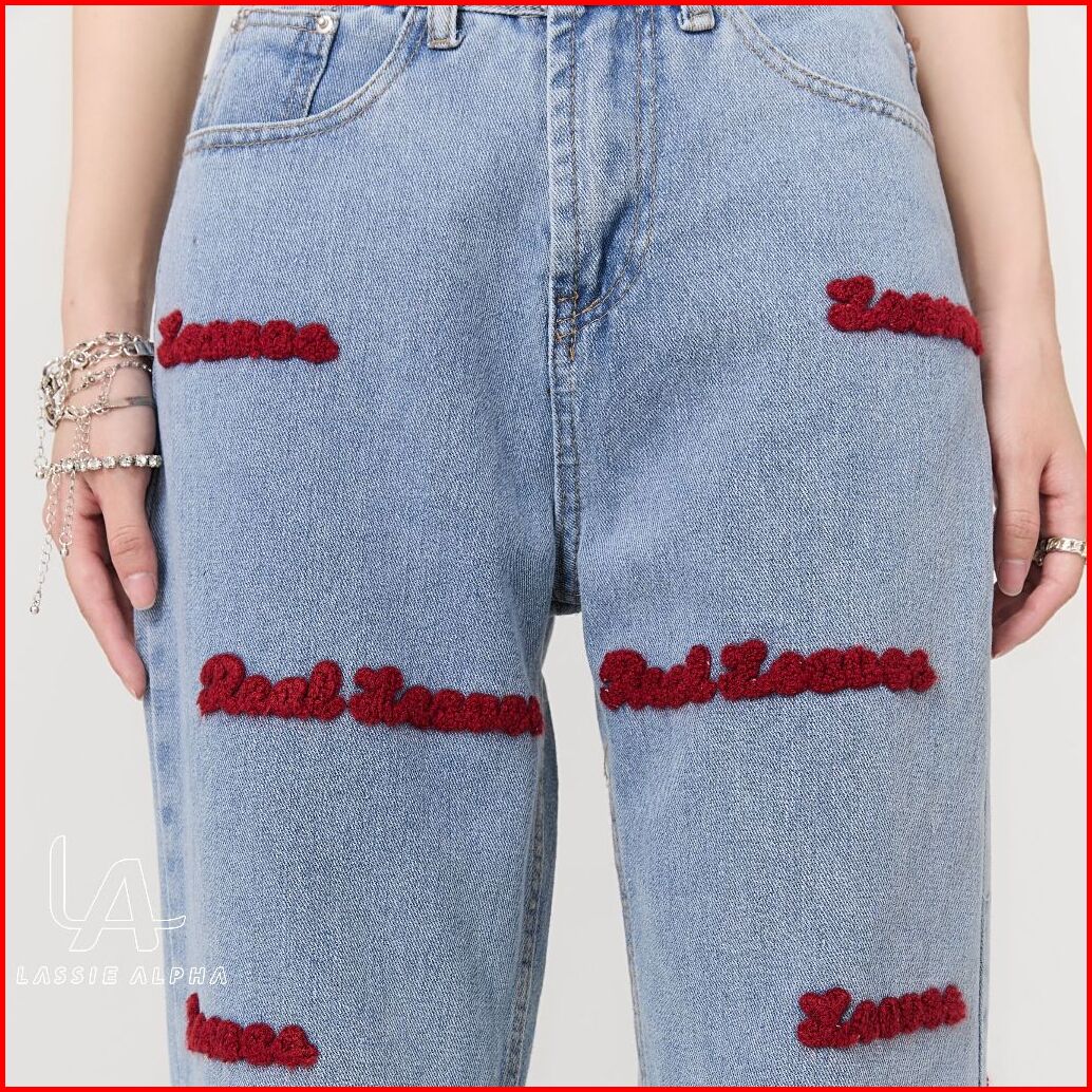 Special Lassie Alpha--j50 Cuci Gudang Jeans Bersulam Merah Muda Celana Panjang Hw Kulot Jeans