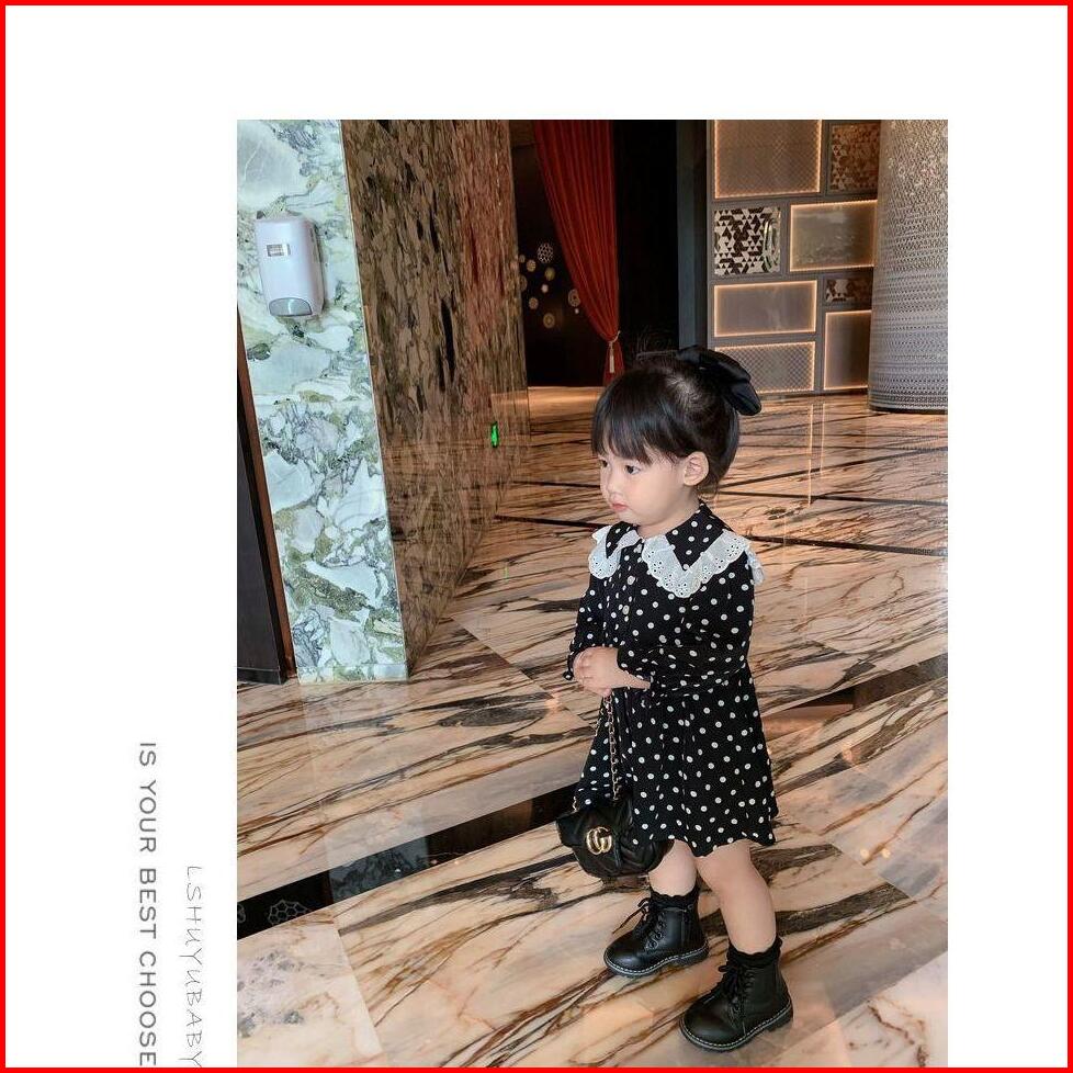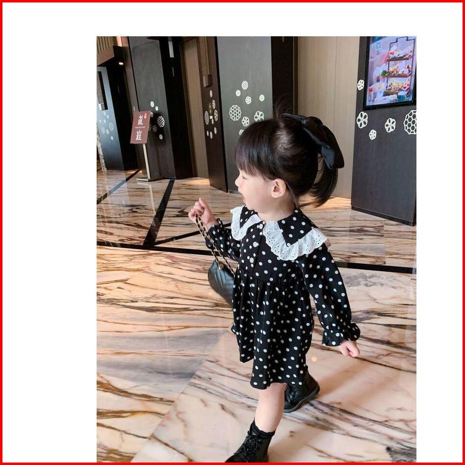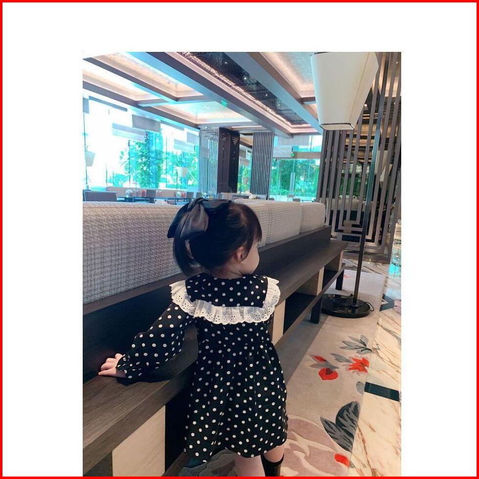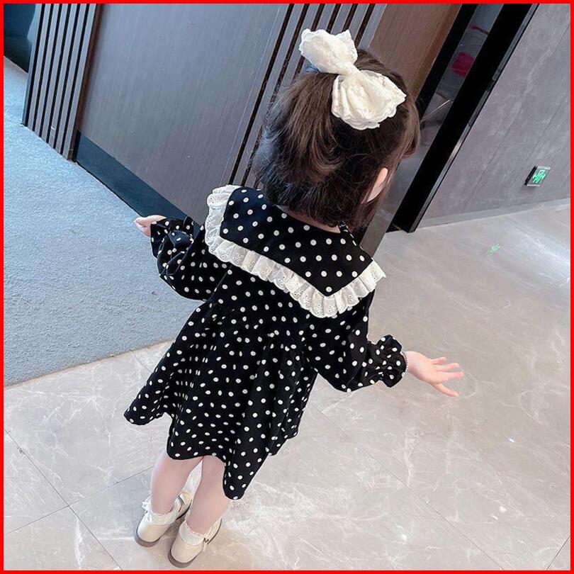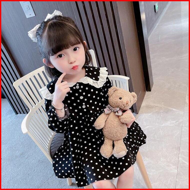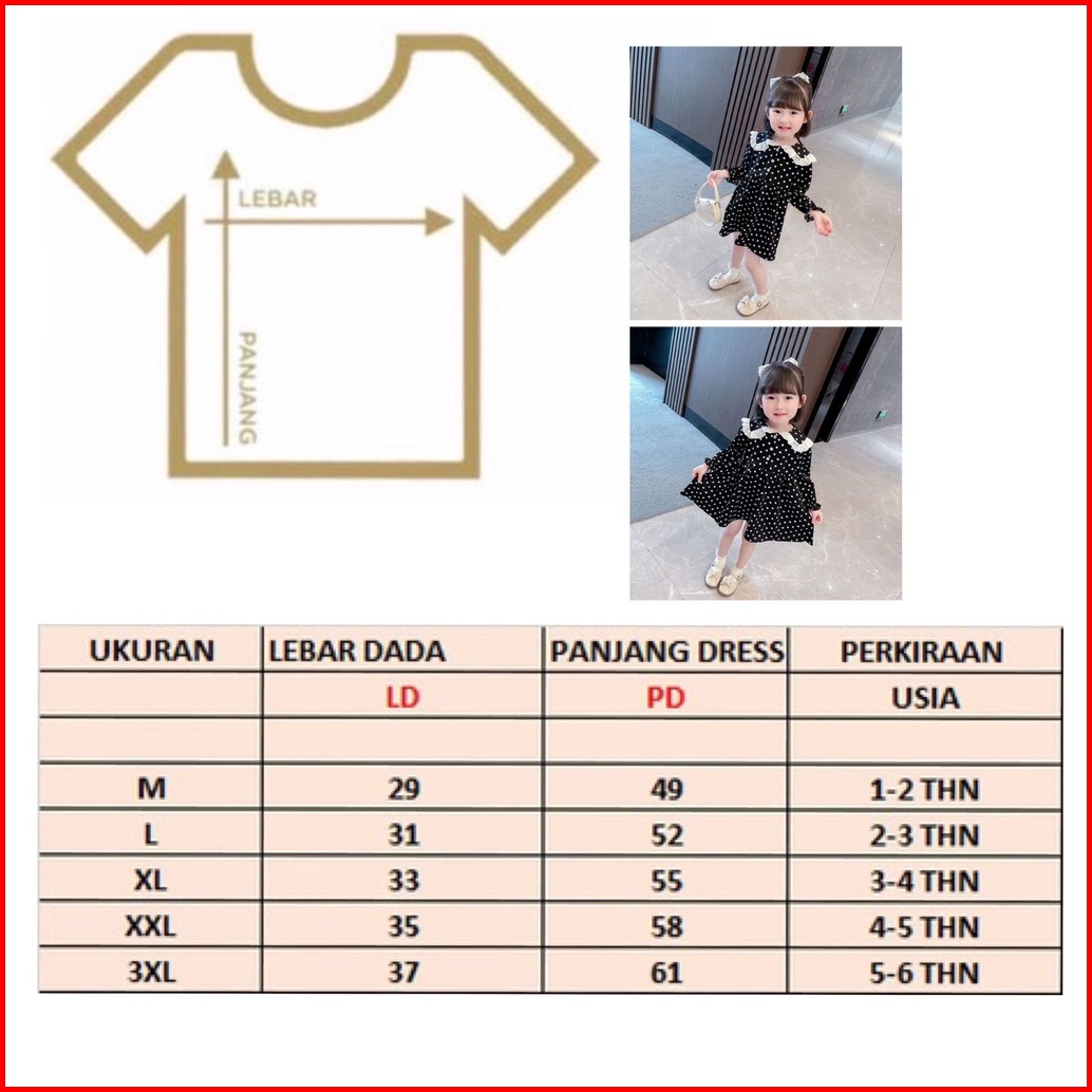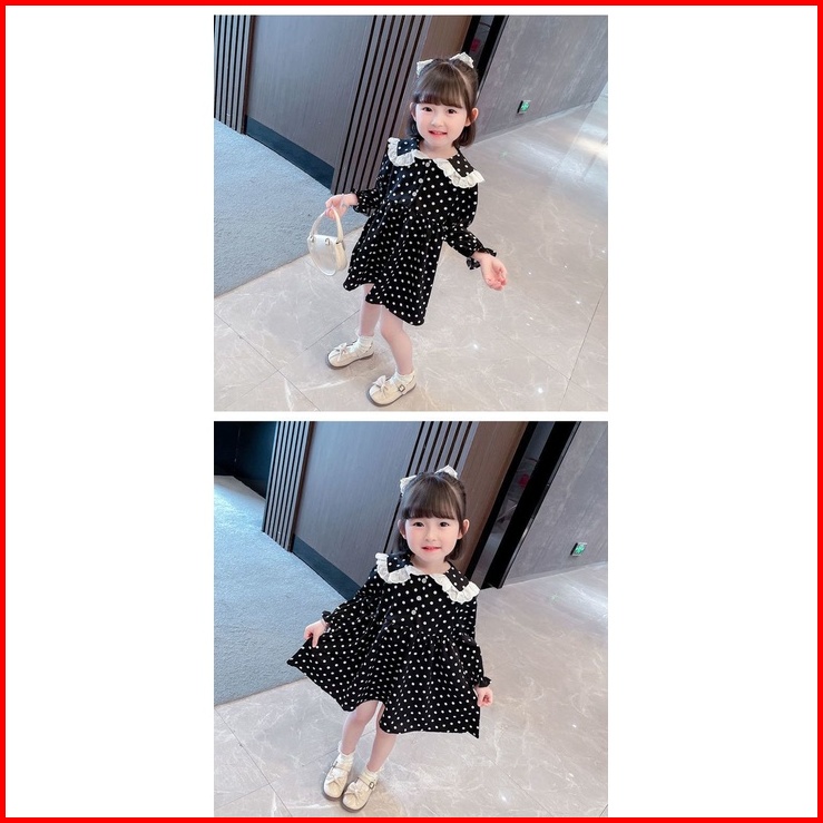 Filobee Dress Anak Perempuan Dress Polkadot Hitam Model Kerah Bulat Tempel Renda F002