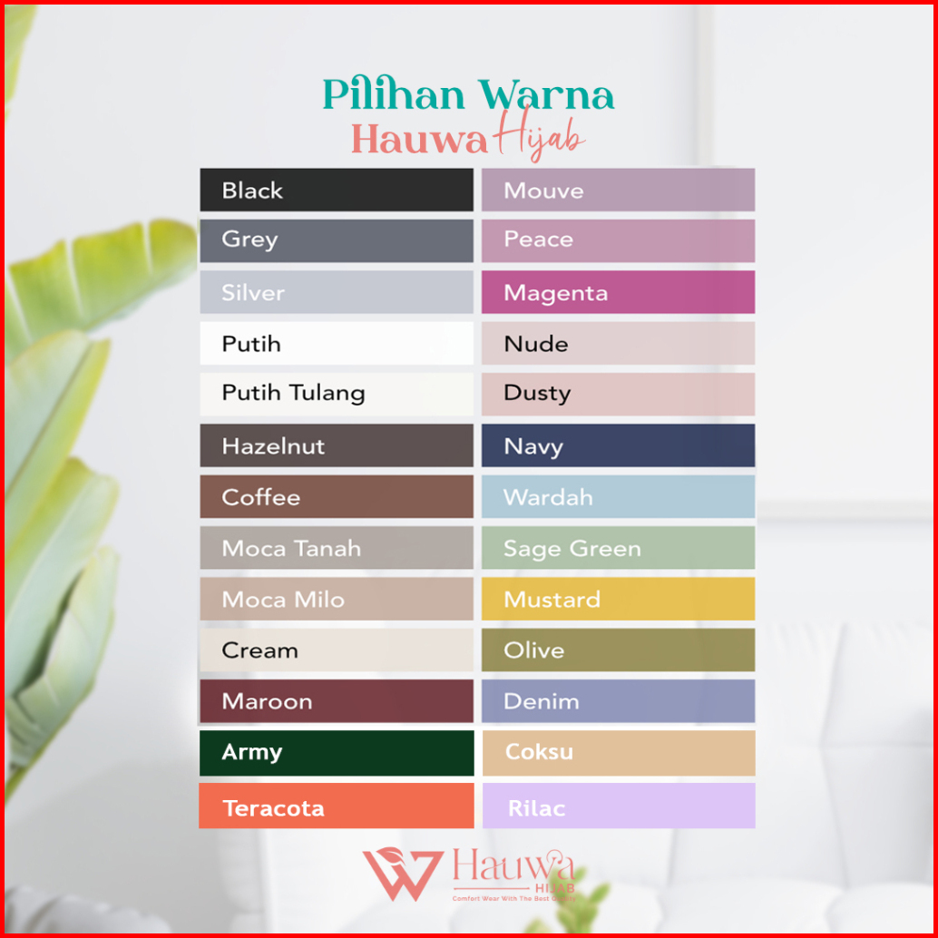 Tanah, Milo, Cream, Nude, Dusty, Coksu, Hitam, Abu Grey, Abu Silver, Mahogany, Coffe, Maroon, Magenta, Peace, Mouve, Navy, Denim, Stella, Army, Olive, Sage Green, Mustard, Rilac