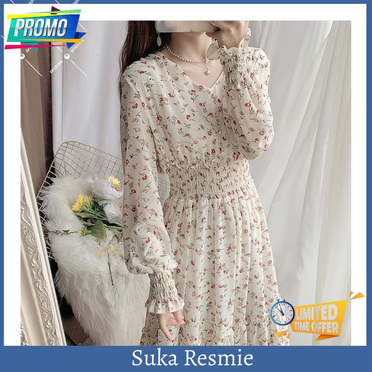 JESSICA Dress motif tunik bunga sifon lengan panjang Import Korean Style