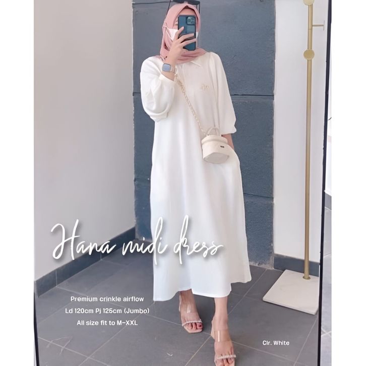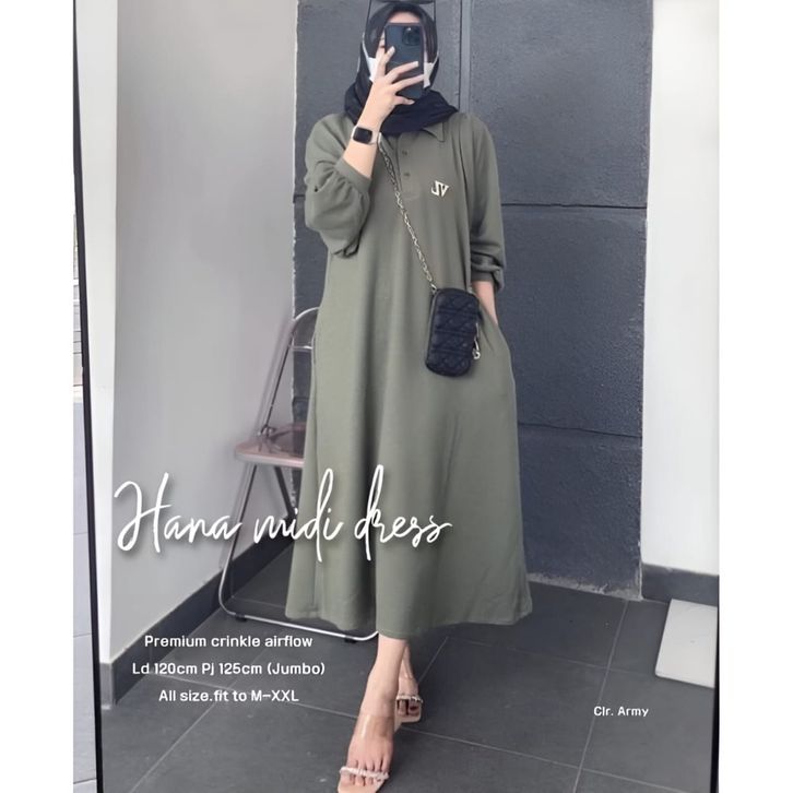 Hana Midi Collar Shirt Crinkle Flow Premium Dress Maxy Wanita Muslim Polos Basic Kekinian Terbaru