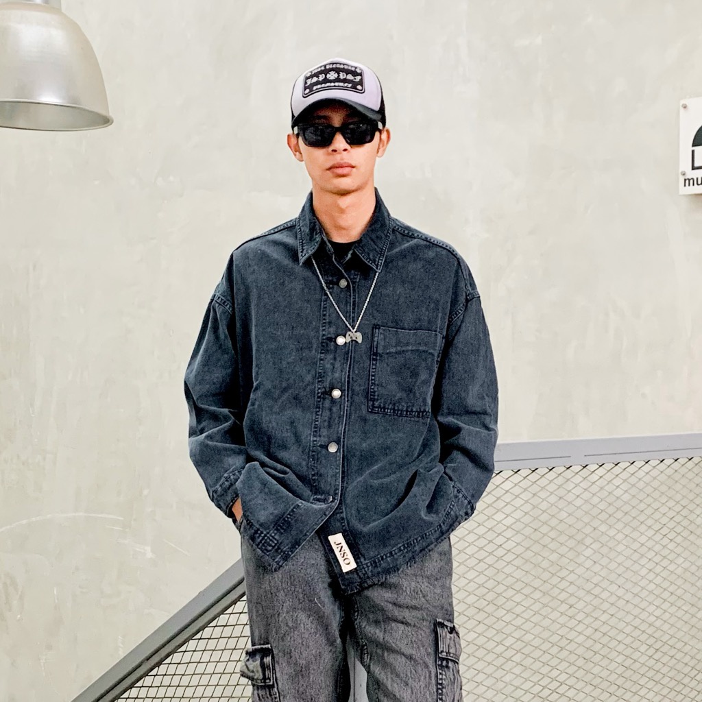 JINISO Pria Jaket Jeans Oversize Basic Pocket Black Acid