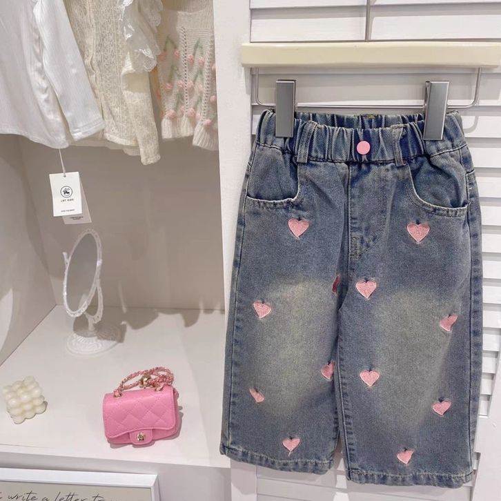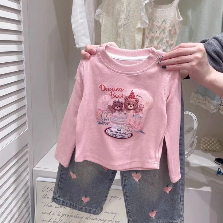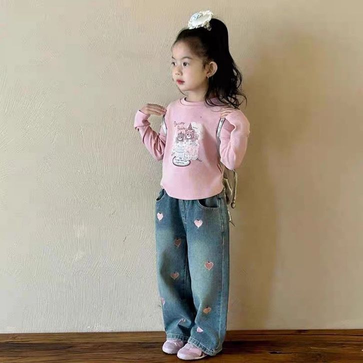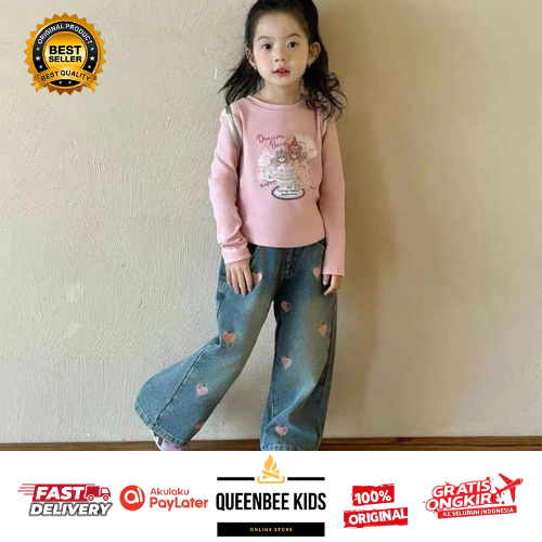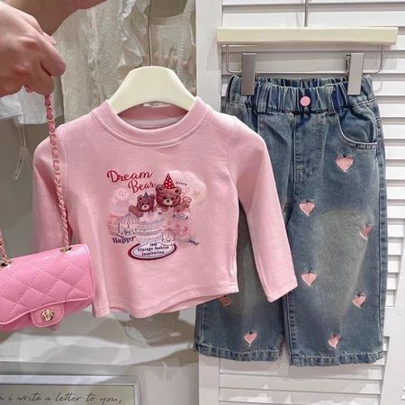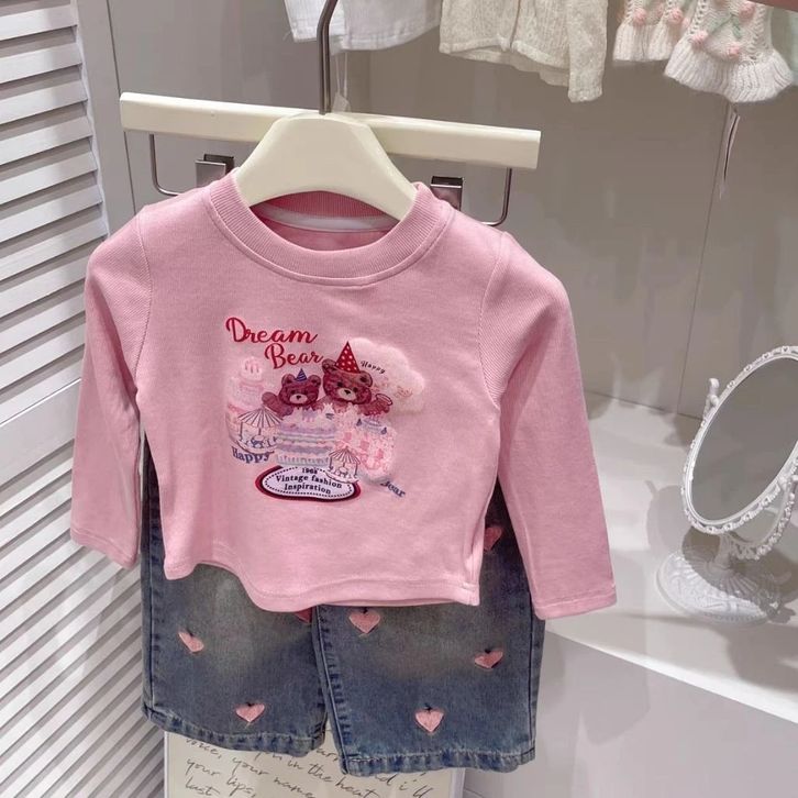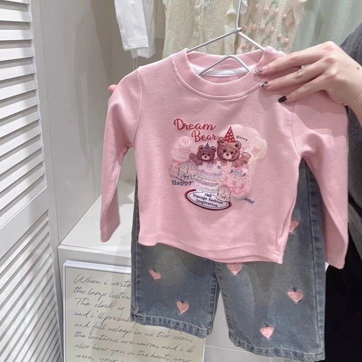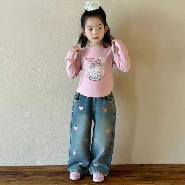 Baju Setelan Pink Lucu Anak Kekinian / Baju Lengan Panjang + Celana Jeans Love Baju Fashion Anak Terbaru