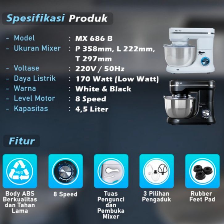 Stand Mixer 4,5 Liter SEKAI MX686B Pengaduk Adonan Low Watt