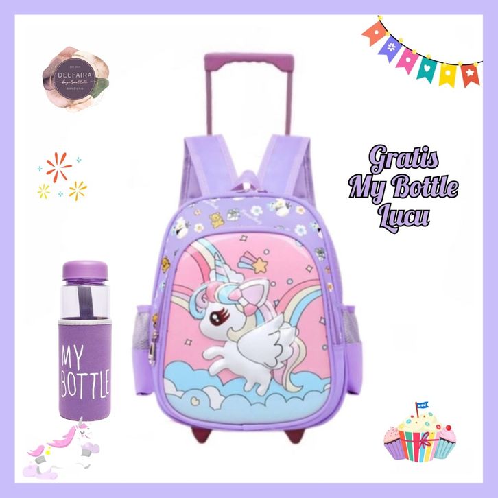 Tas Troli Anak Perempuan Motif Un1qorn Pelang1 Wrn1 Gratis Botol Minum Lucu Untuk Tk Paud Dan Sd
