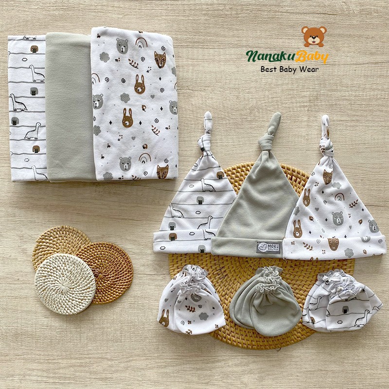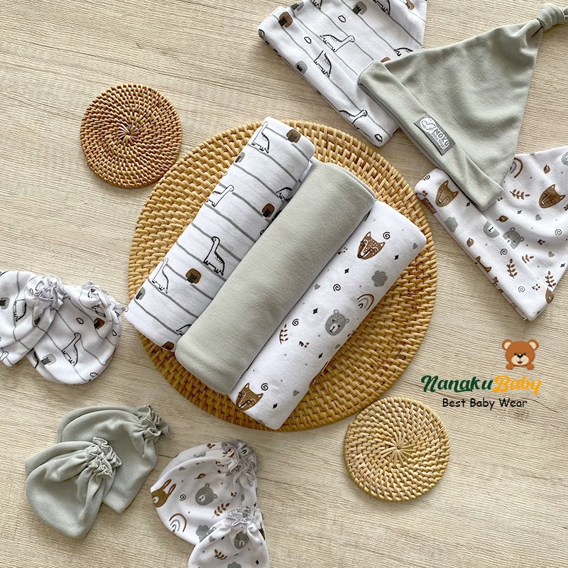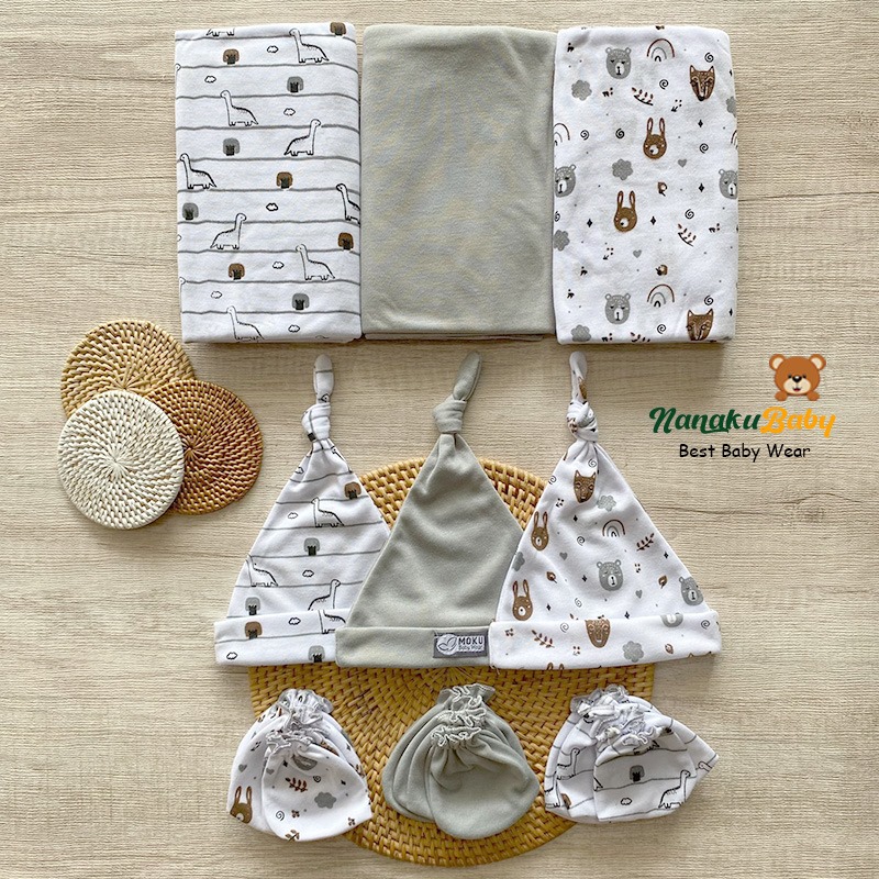Nanaku Baby - 4 In 1 Paket Bayi Newborn Set Lengkap 3 Pcs Bedong + 3 Set Kupluk Sarung Tangan Sarung Kaki NB Kelinci Abu