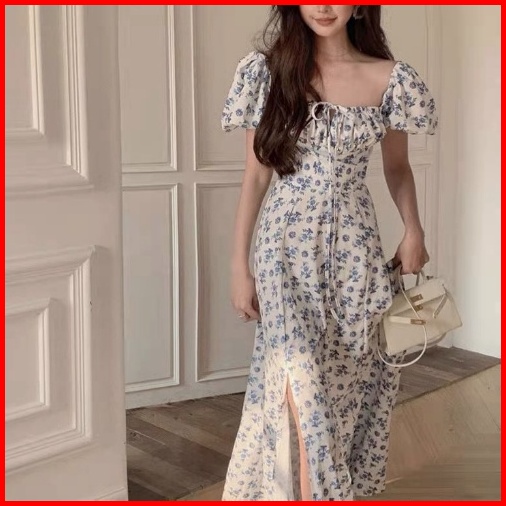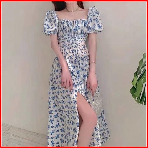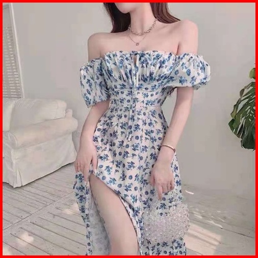 Maxi White And Blue Floral Dress With Puffy Sleeve Dress Casual Kasual Summer Dress Daisy Dress Off Shoulder Dress Vinta