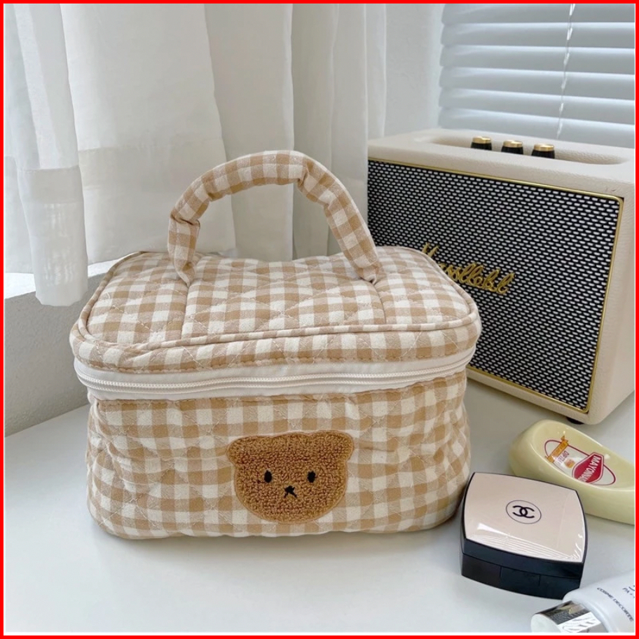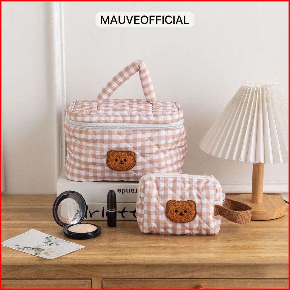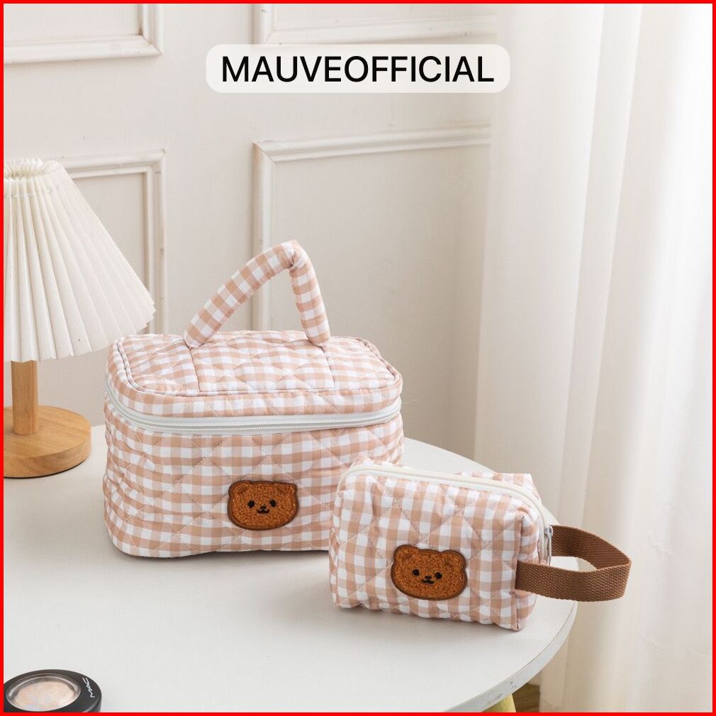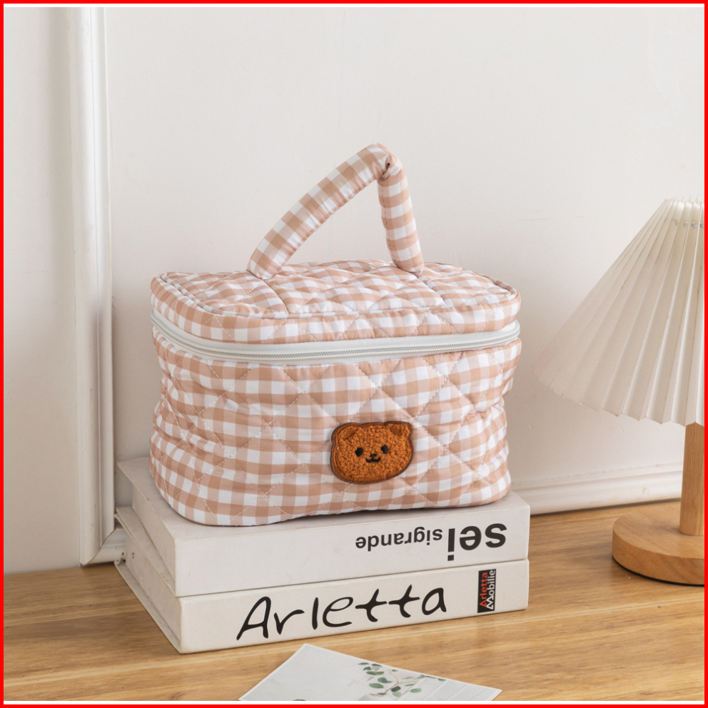 Mauve Teddy Grid Pouch Makeup Aesthetic Bear Handle Tas Kosmetik Brush Make Up Besar Muat Banyak