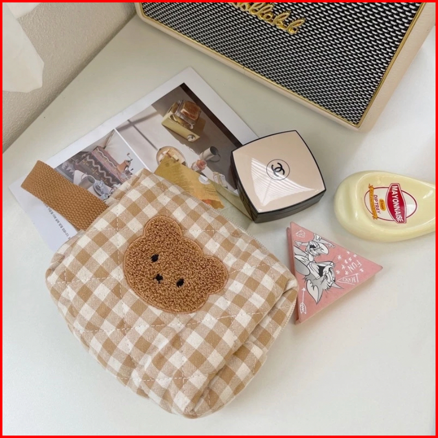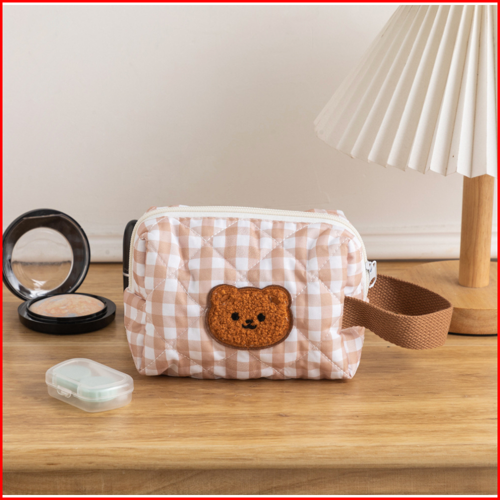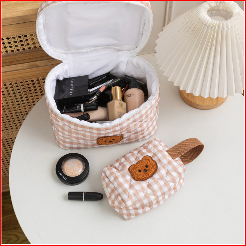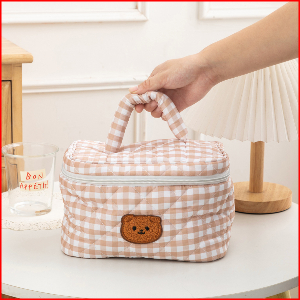 Mauve Teddy Grid Pouch Makeup Aesthetic Bear Handle Tas Kosmetik Brush Make Up Besar Muat Banyak