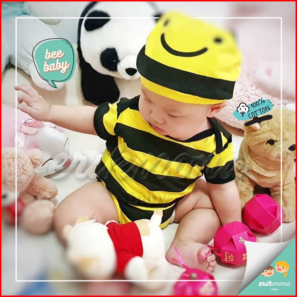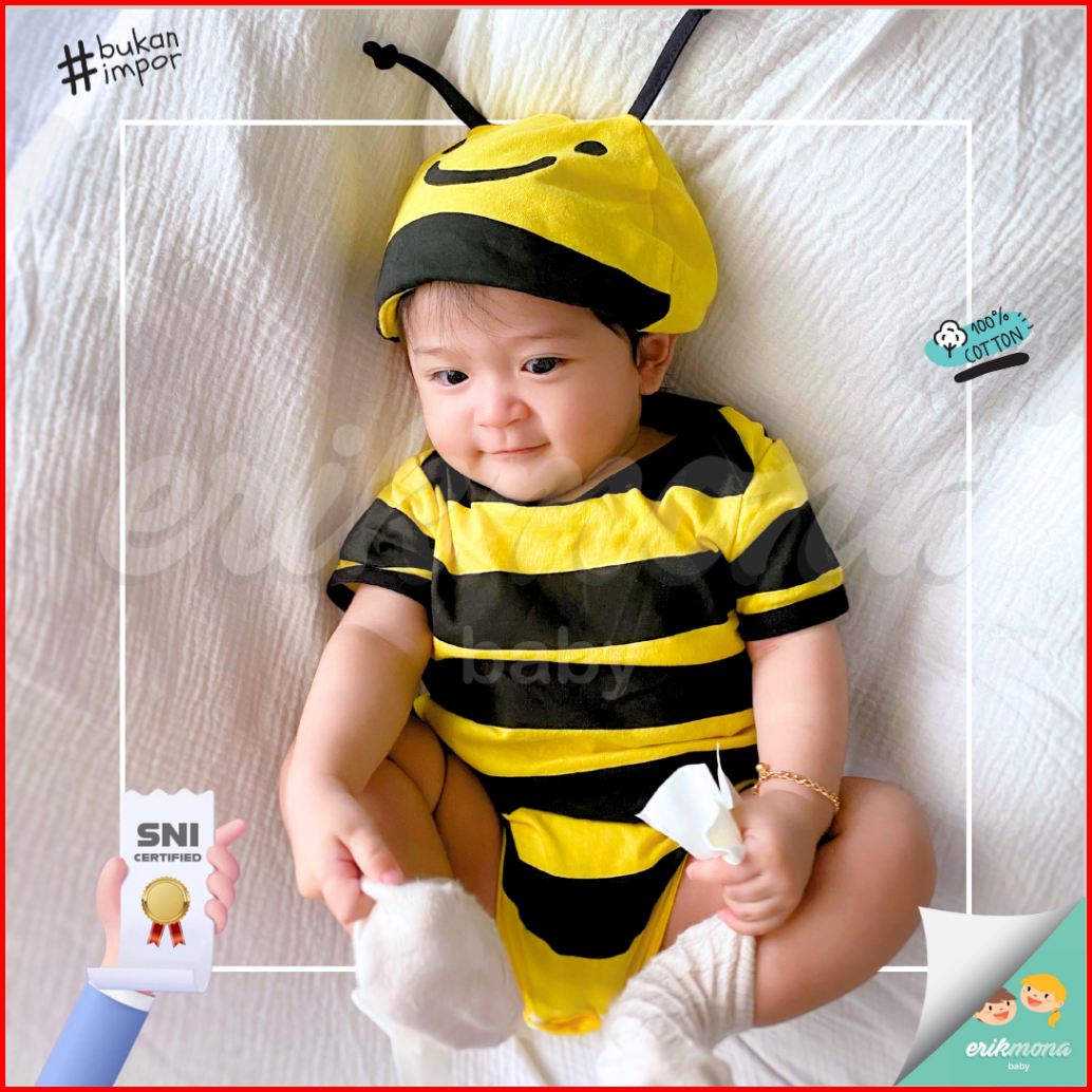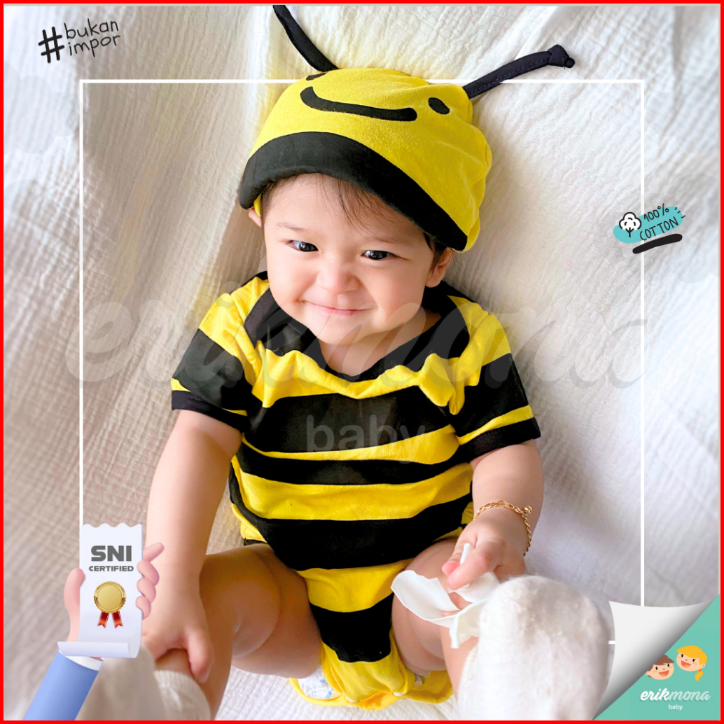 Ermon Baby - Jumper Bayi Laki Laki Perempuan Jumper Baby Cowok Cewek Lucu Karakter Lebah Bee Topi Usia 0 - 12 Bulan