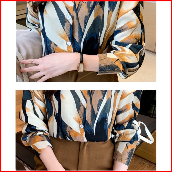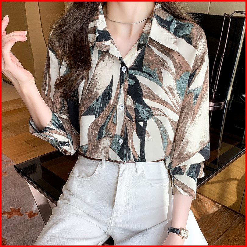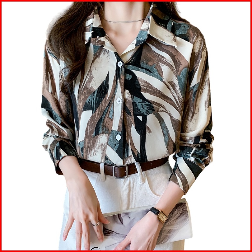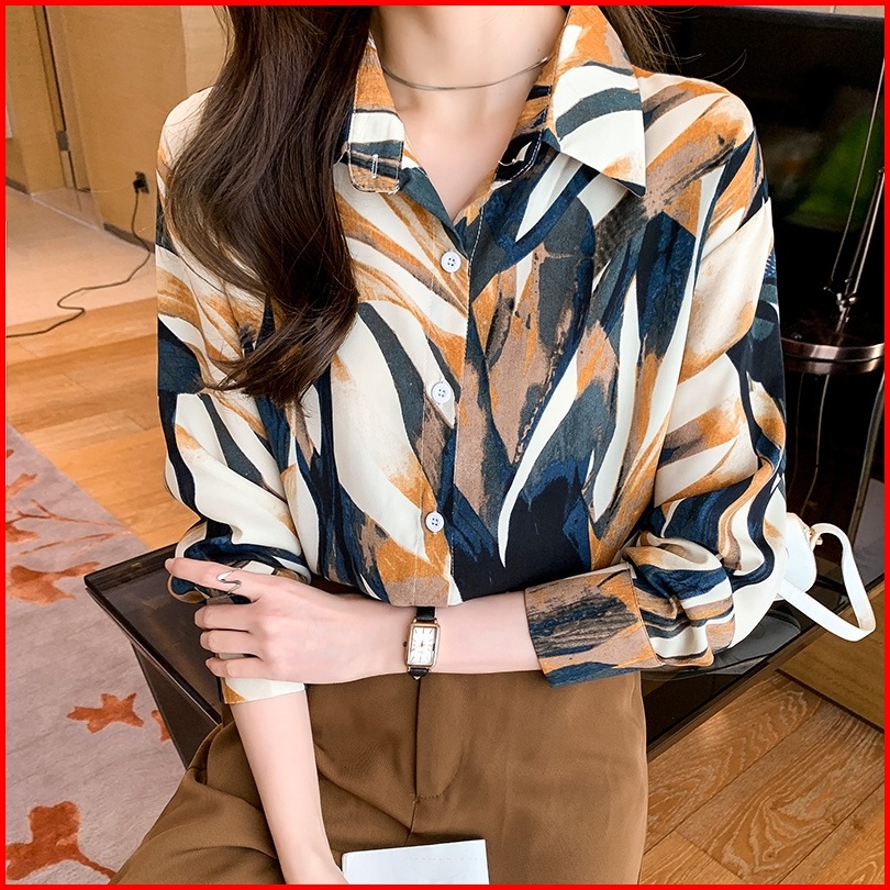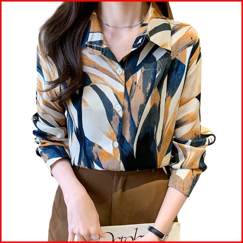Kain Berkualitas Tinggi Fashion Jalanan Korea Atasan Wanita Kemeja Lengan Panjang Grafiti Hijau Biru Kuning Kemeja Kerja