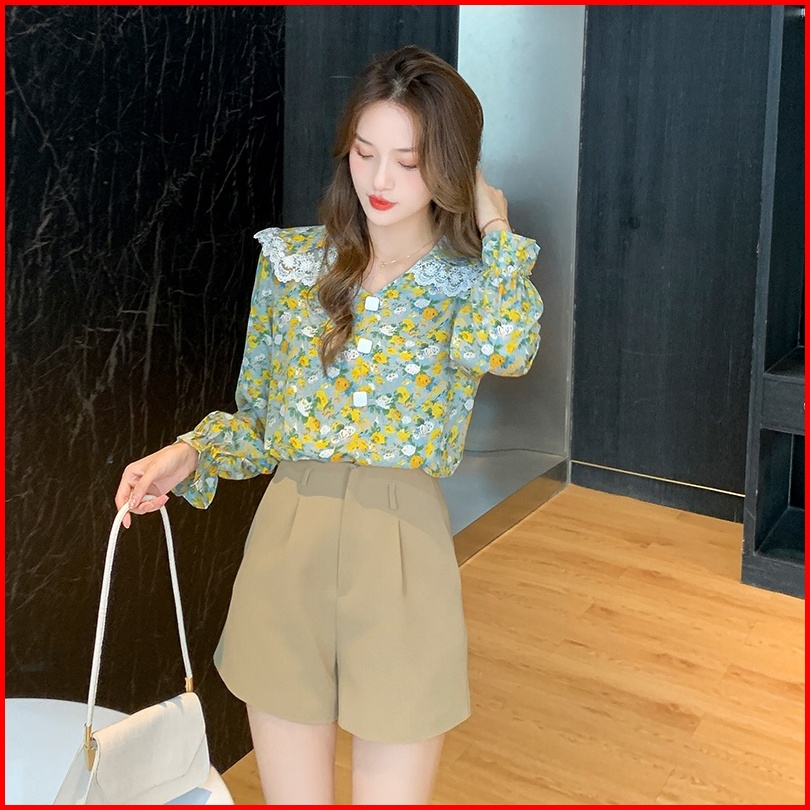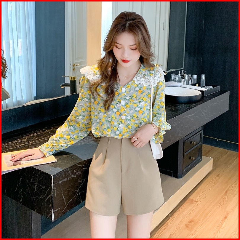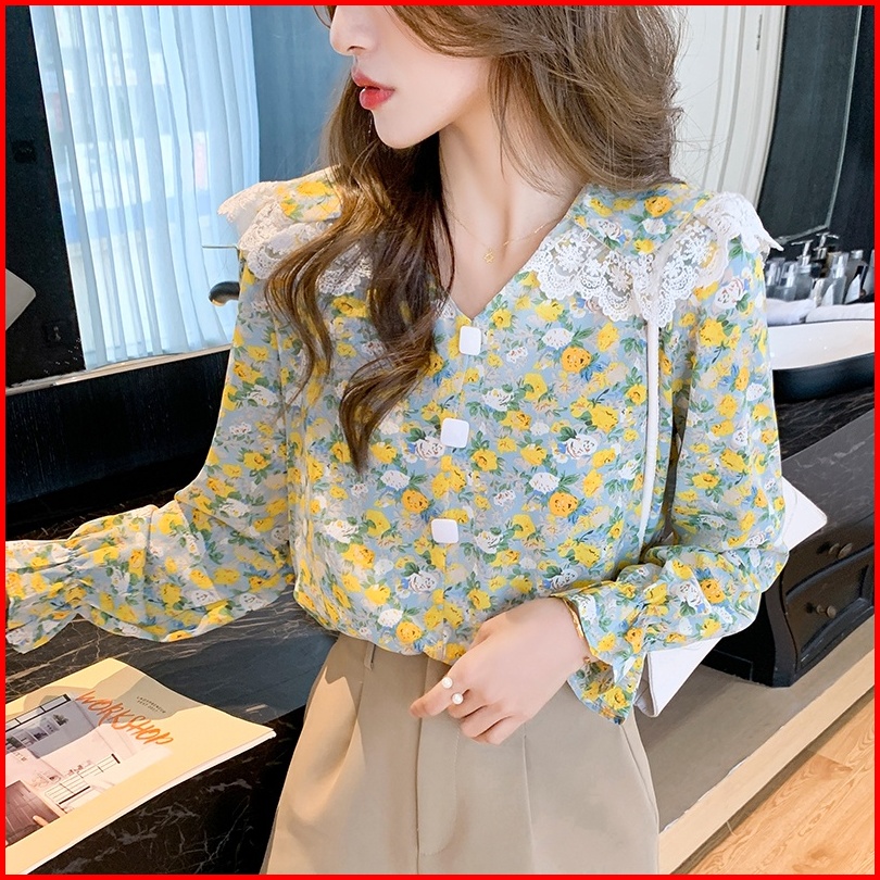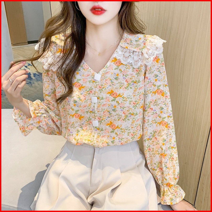 Fashion Korean Chiffon Floral Long Sleeve Shirts Orange Green Women Blouse Tops Pakaian Serban