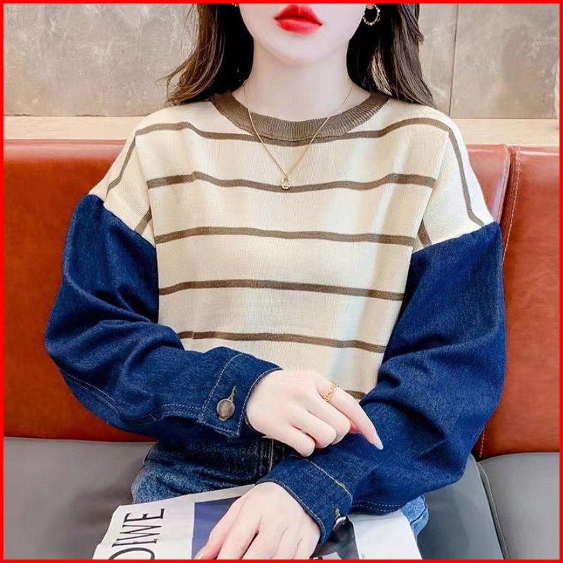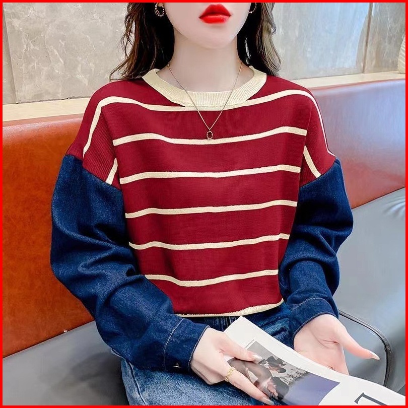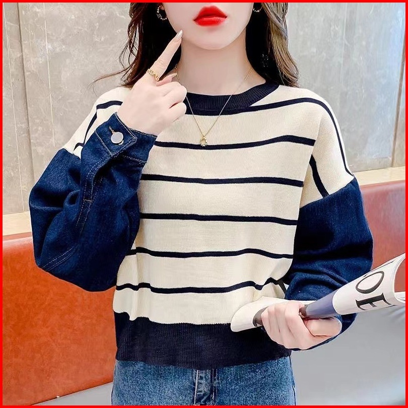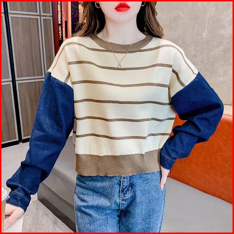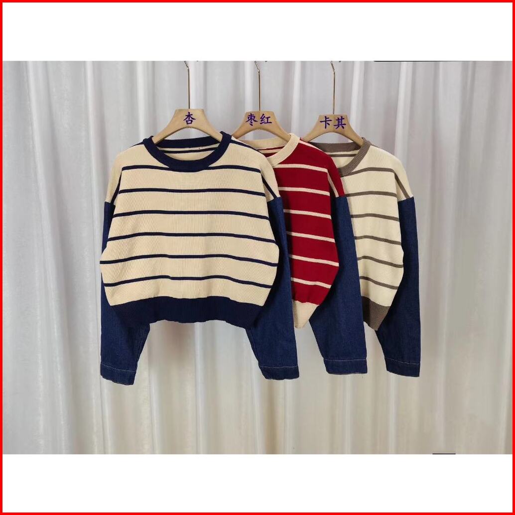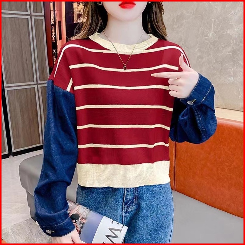 Savita Top Knit Basic Stripe Lengan Jeans Polos - Atasan Wanita Rajut Tm
