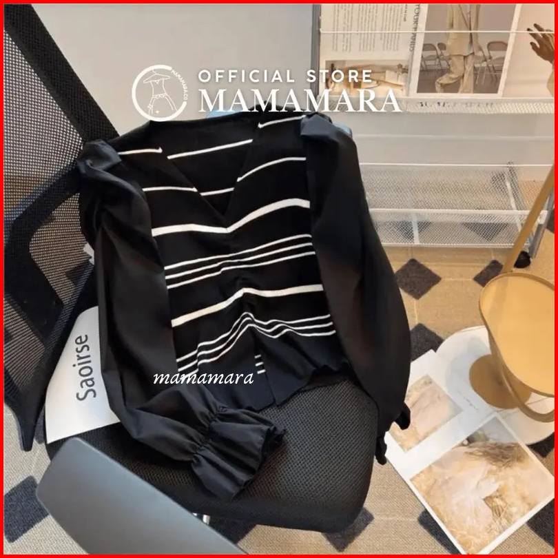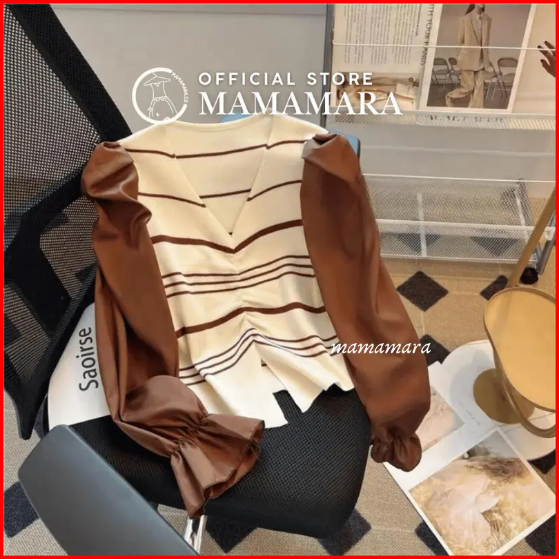 Mamamara - Atasan Knitwear Garis V-neck Rajut Wol Blouse Korean Style Pastel Santai Bunga Setrip