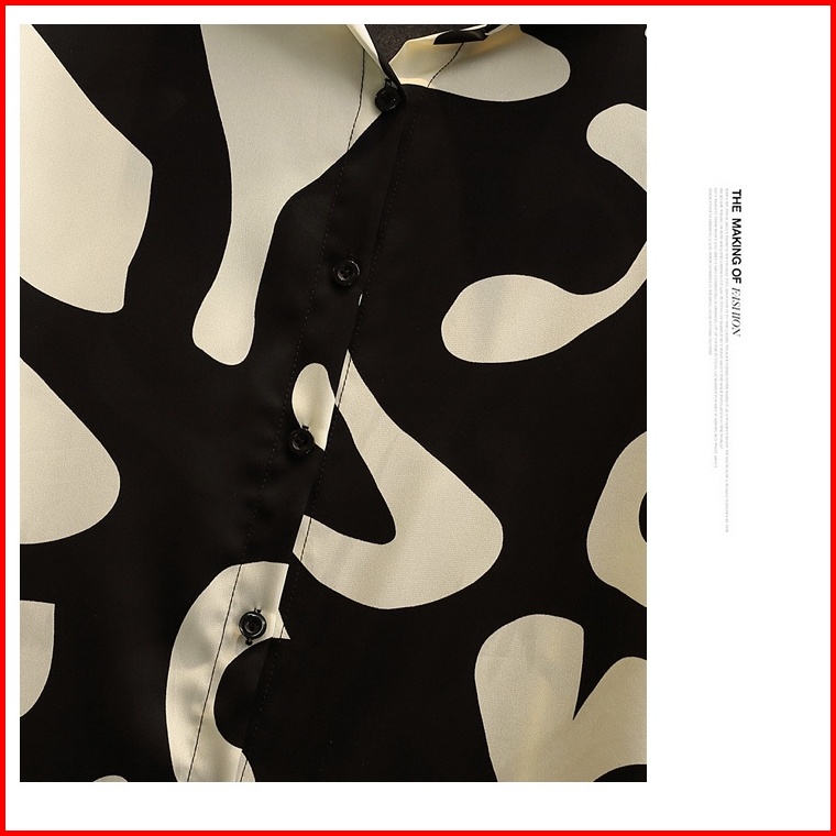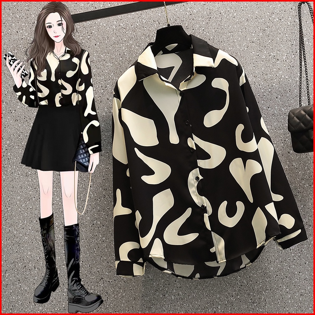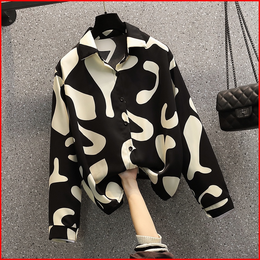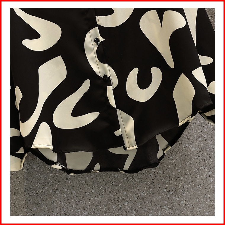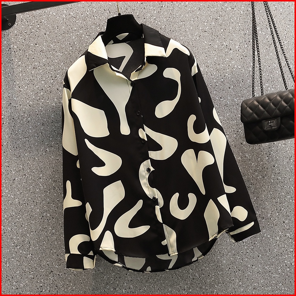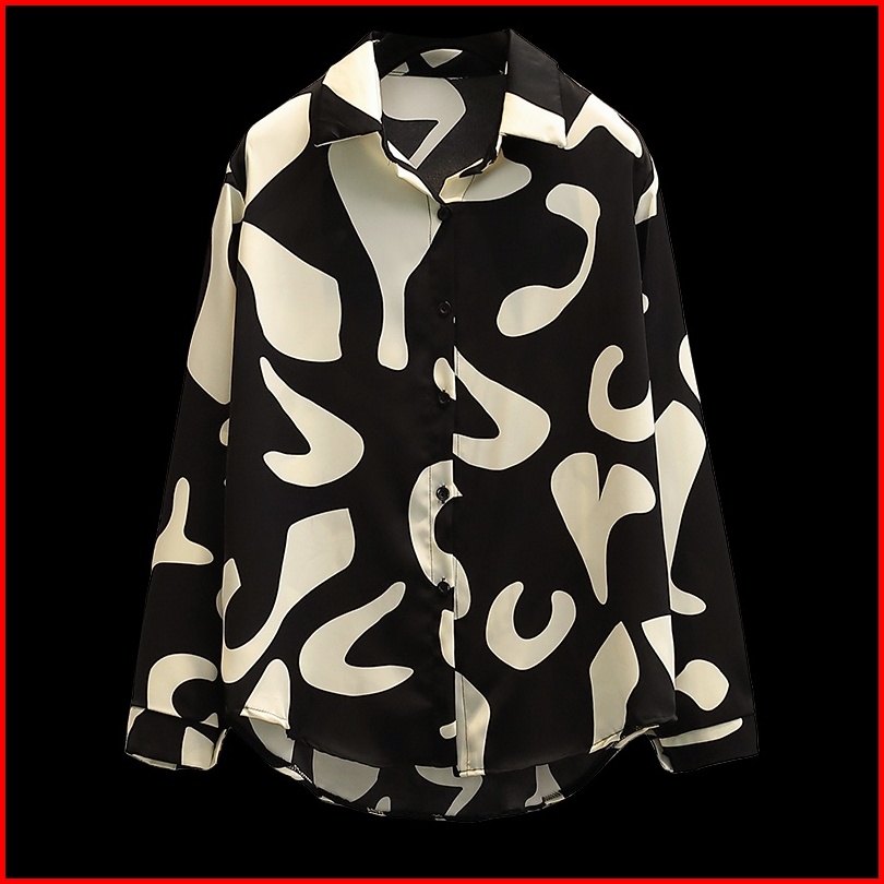 New 2025 Fashion Cetakan Geometris Korea Trendy Kemeja Lengan Panjang Hitam Sifon Berkualitas Tinggi Atasan Wanita Kemej