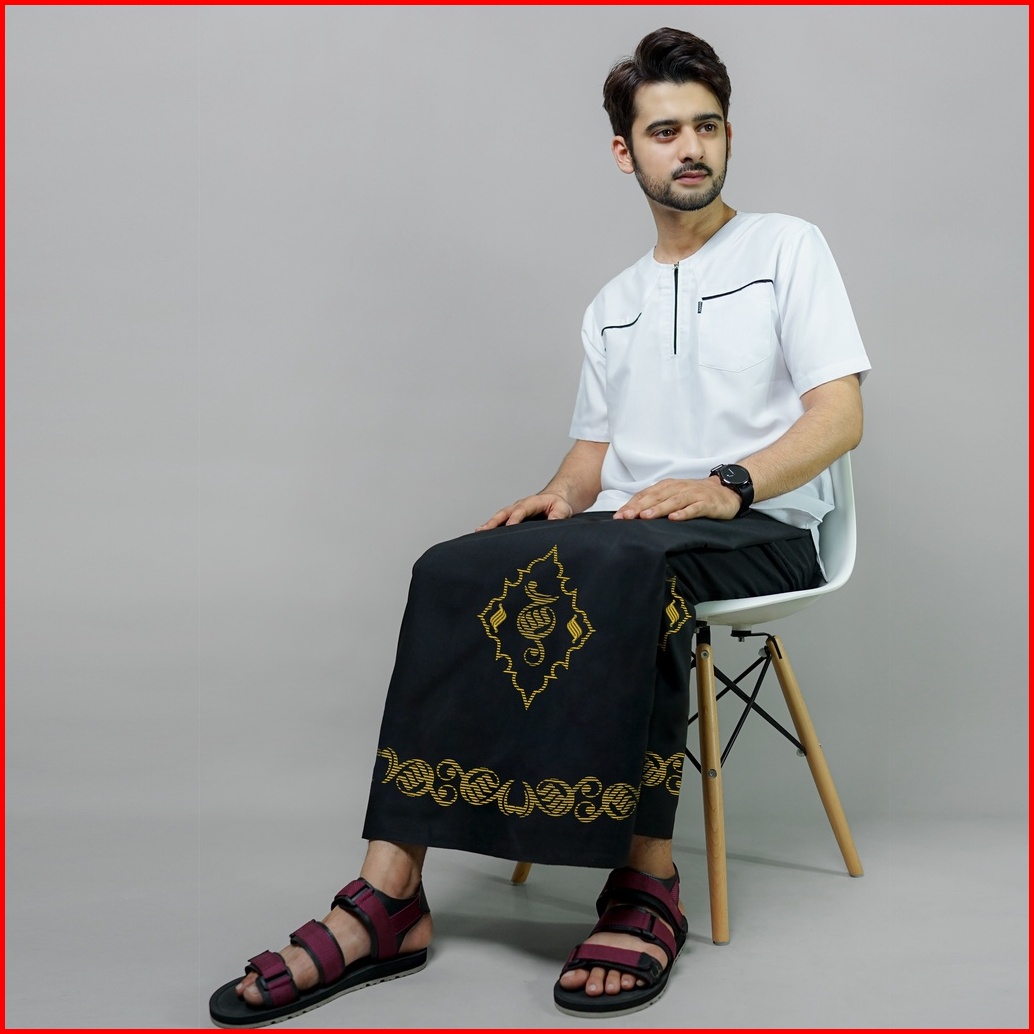 Katsae - Sarung Bordir Motif Kaligrafi Hasan Bordir Timbul Sarung Pria Dewasa Warna Hitam Sarung Sholat 100 Bordir