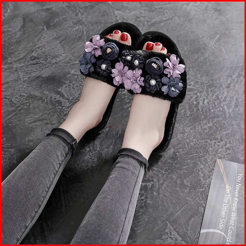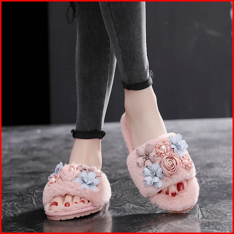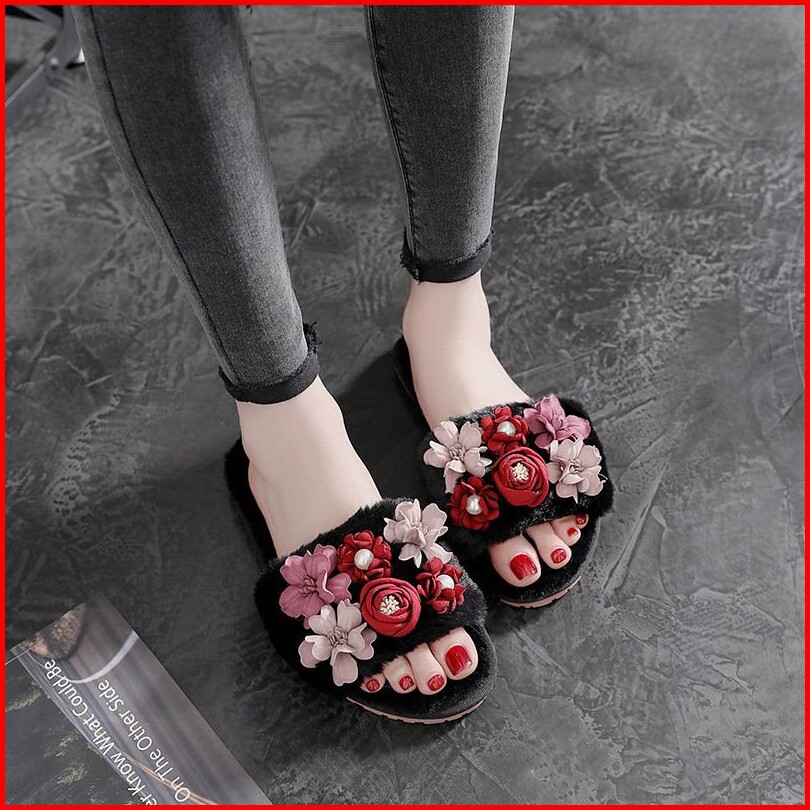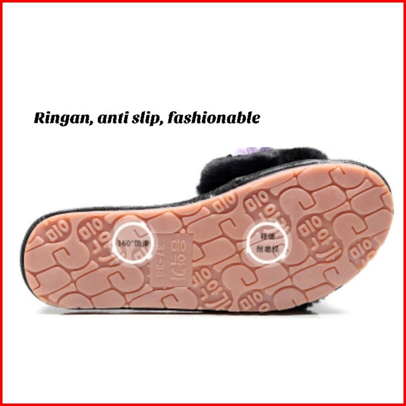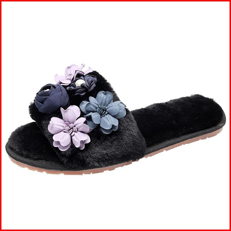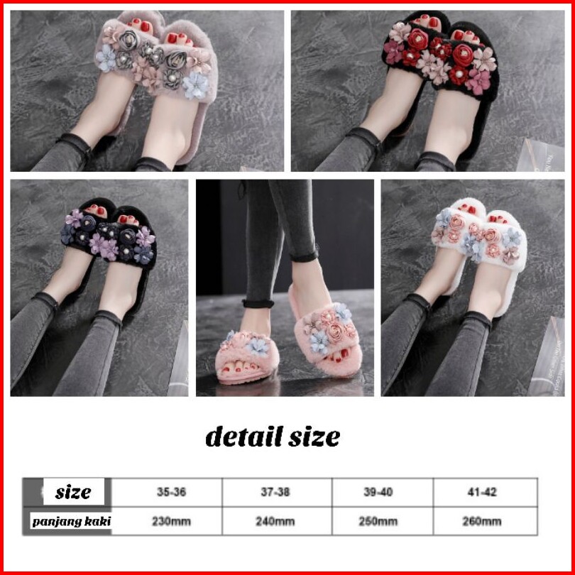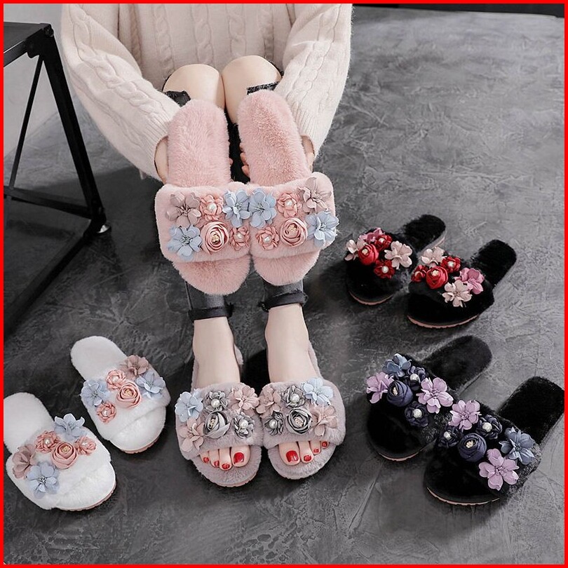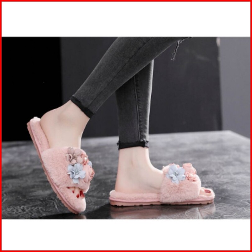 Sandal Slide Selop Rumah Kamar Bulu Empuk Hangat Korean Style Karet Anti Slip Bunga Kecil