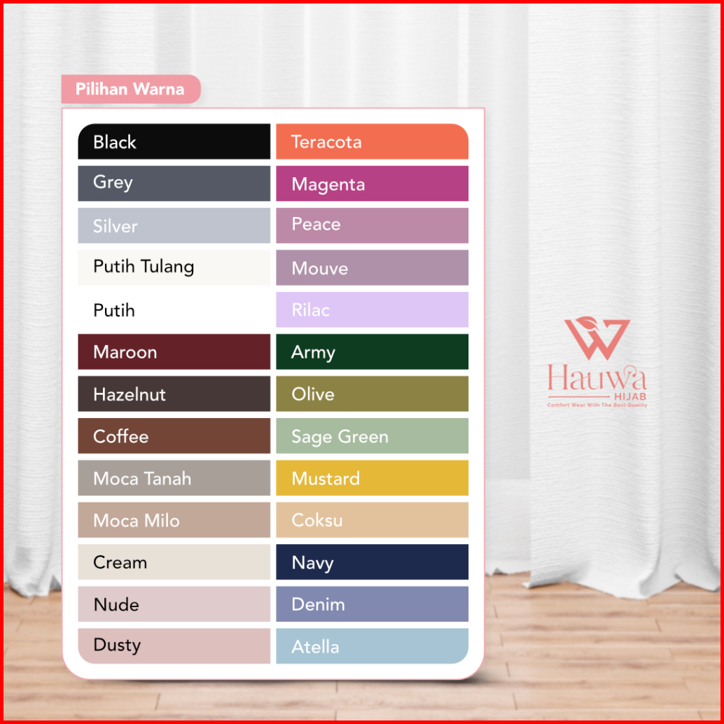 Moca Milo, Coksu, Cream, Nude, Salem/Dusty, Moca Tanah, Hitam, Abu Grey, Abu Silver, Mahogany, Burgundy, Coffe, Teracota, Maroon, Magenta, Mouve, Navi, Denim, Army, Olive, Sage green, Putih, Merah Cabe/Indonesia