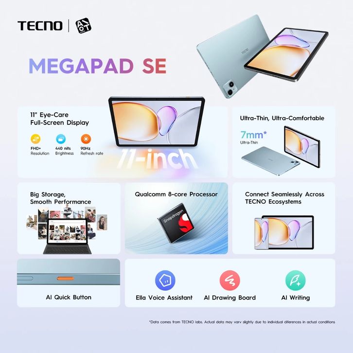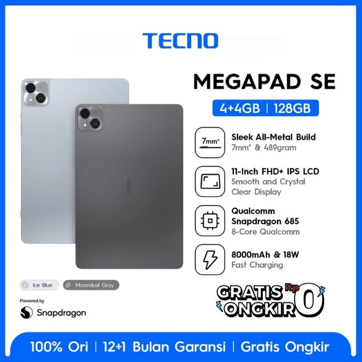 TABLET TAB TECNO MEGAPAD SE RAM 4+4GB/128GB QUALCOMM SNAPDRAGON 685 8000MAH LAYAR 11INCH EYE CARE FHD+