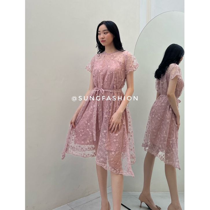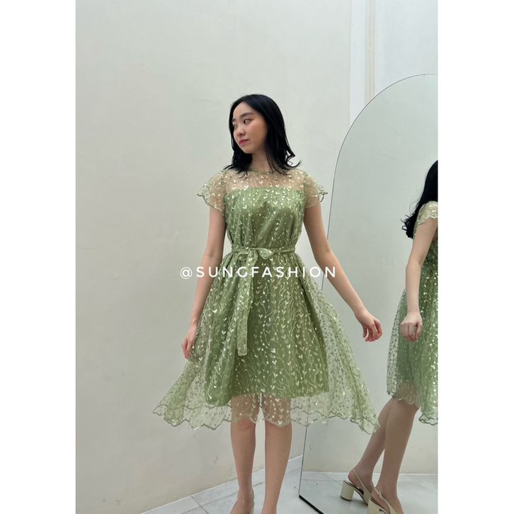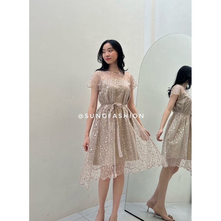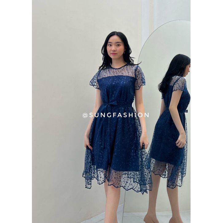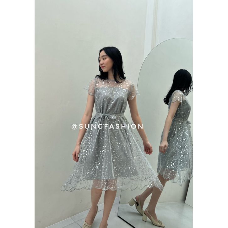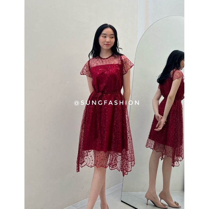 Dress Kondangan Modern Wanita Dress Natal Brokat Bunga Mewah Premium Korean Look Dress Pesta Bridesmaid Terbaru S142