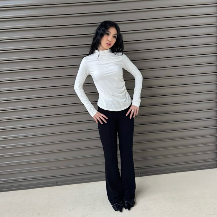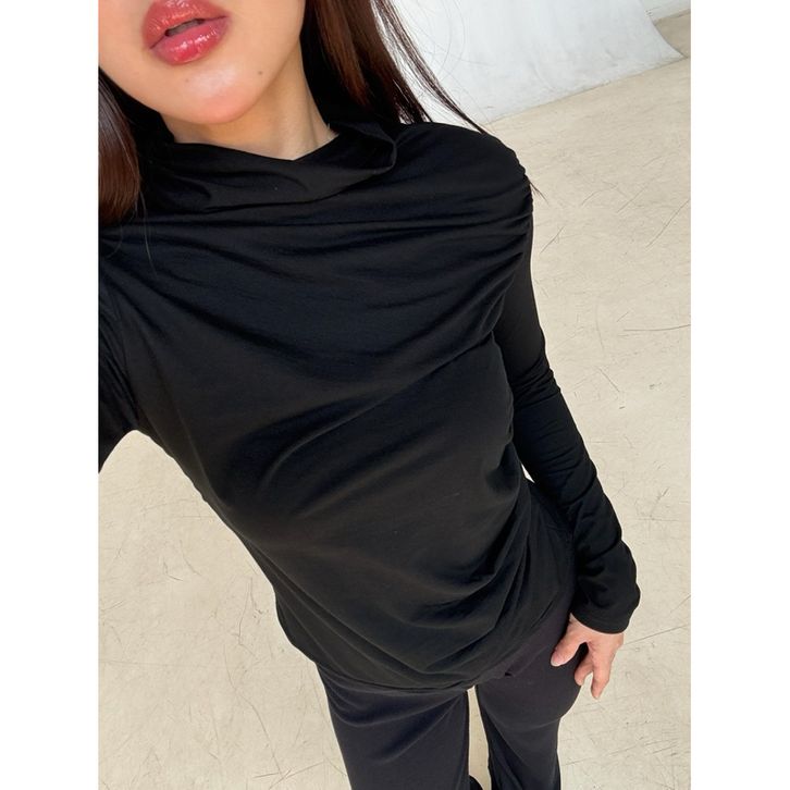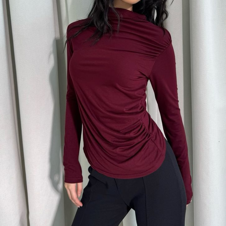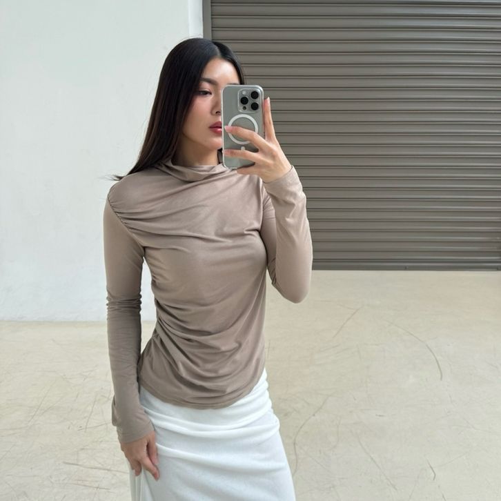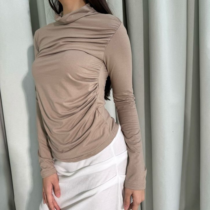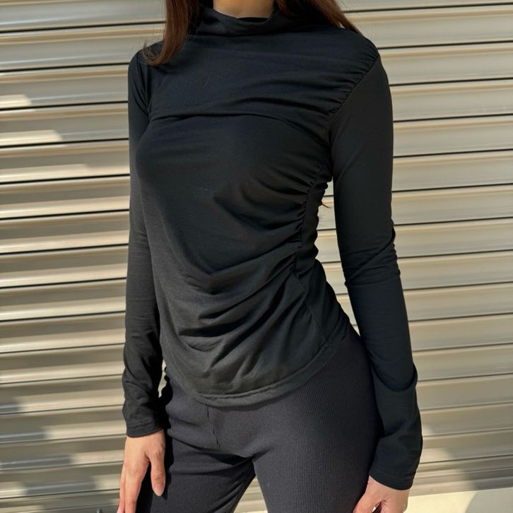 Basic Ruched Top Spandex Rample Kaos High Neck Basic Long Top Summer Atasan Wanita