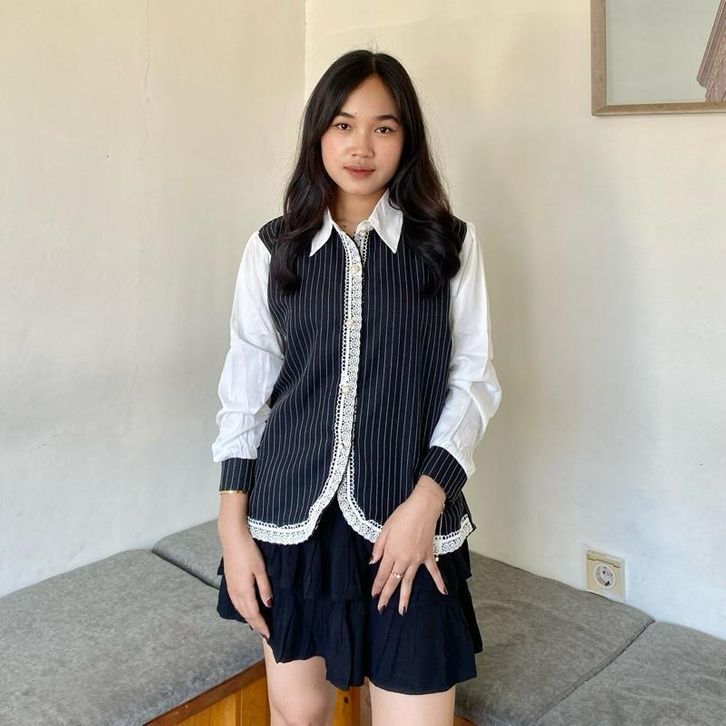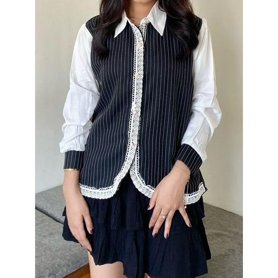 Atasan Wanita Kekinian - Kemeja Wanita Salur kombinasi renda Lengan Panjang Dewasa Atasan Casual