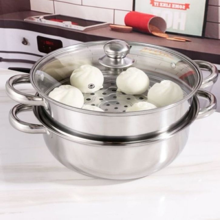 Panci Kukus Steamer dua Susun Stainles Steel Tutup Kaca Pengukus Makanan Kukusan Siomay Bakpau Bolu Food Grade cantik