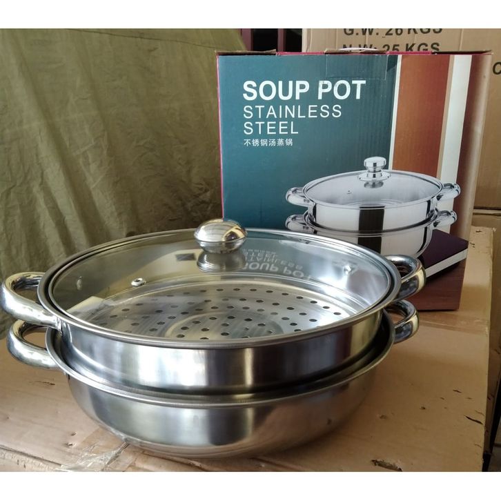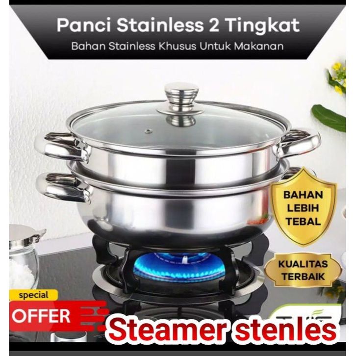 Panci Kukus Steamer 2 Susun Bahan Stenless Steel Size 28 Cm Pengukus Makanan Tutup kaca Kukusan Bakpao Siomay dan lainya