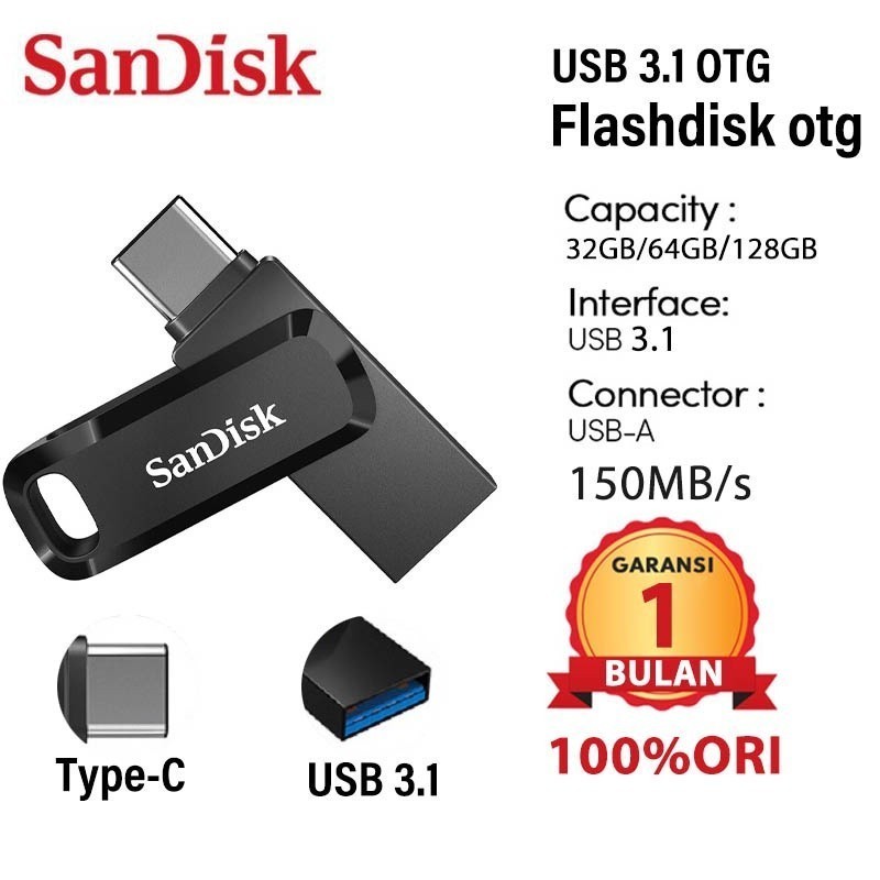 Flashdisk OTG Type C 32GB 64GB 128GB USB 3.1 SanDisk Dual Drive SDDDC3 ORI