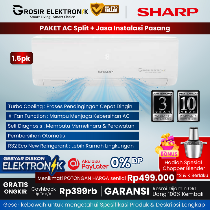 [ +PASANG ] - AC 1PK Hemat Listrik Garuda SuperJet Standard [ SHARP AH-UCY-0.5pk/1.5pk ] - ac sharp 1pk - A1PK - STGE