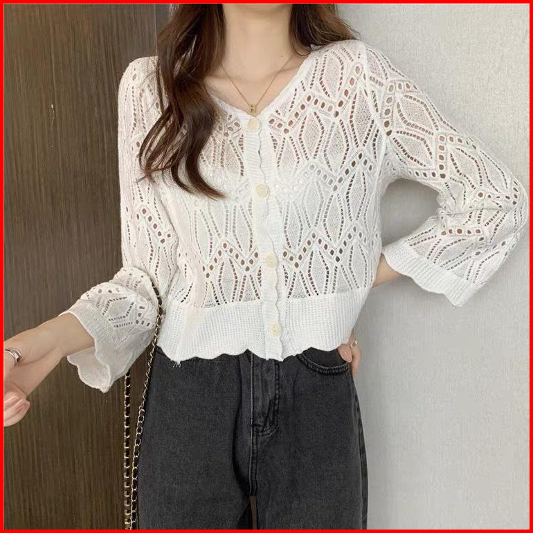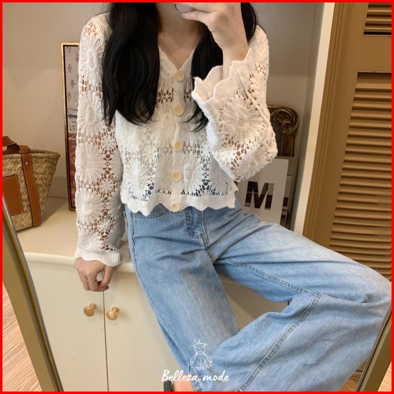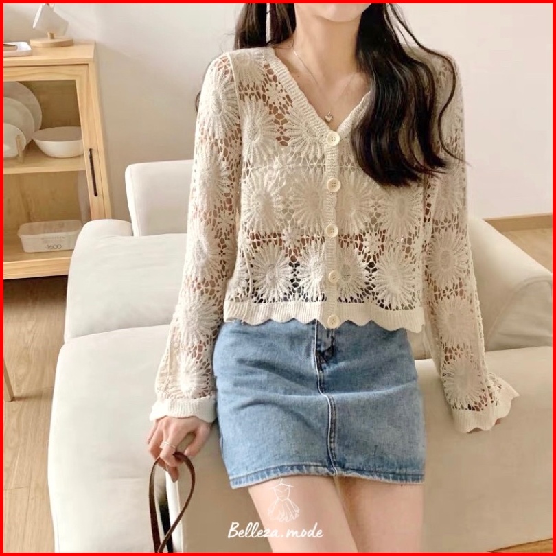 Korean Crochet Cardigan Long Puffy Sleeves Top Kardigan Korean Sexy Lace Brukat Baju Pantai Outer Bikini Rompi Vest Knit