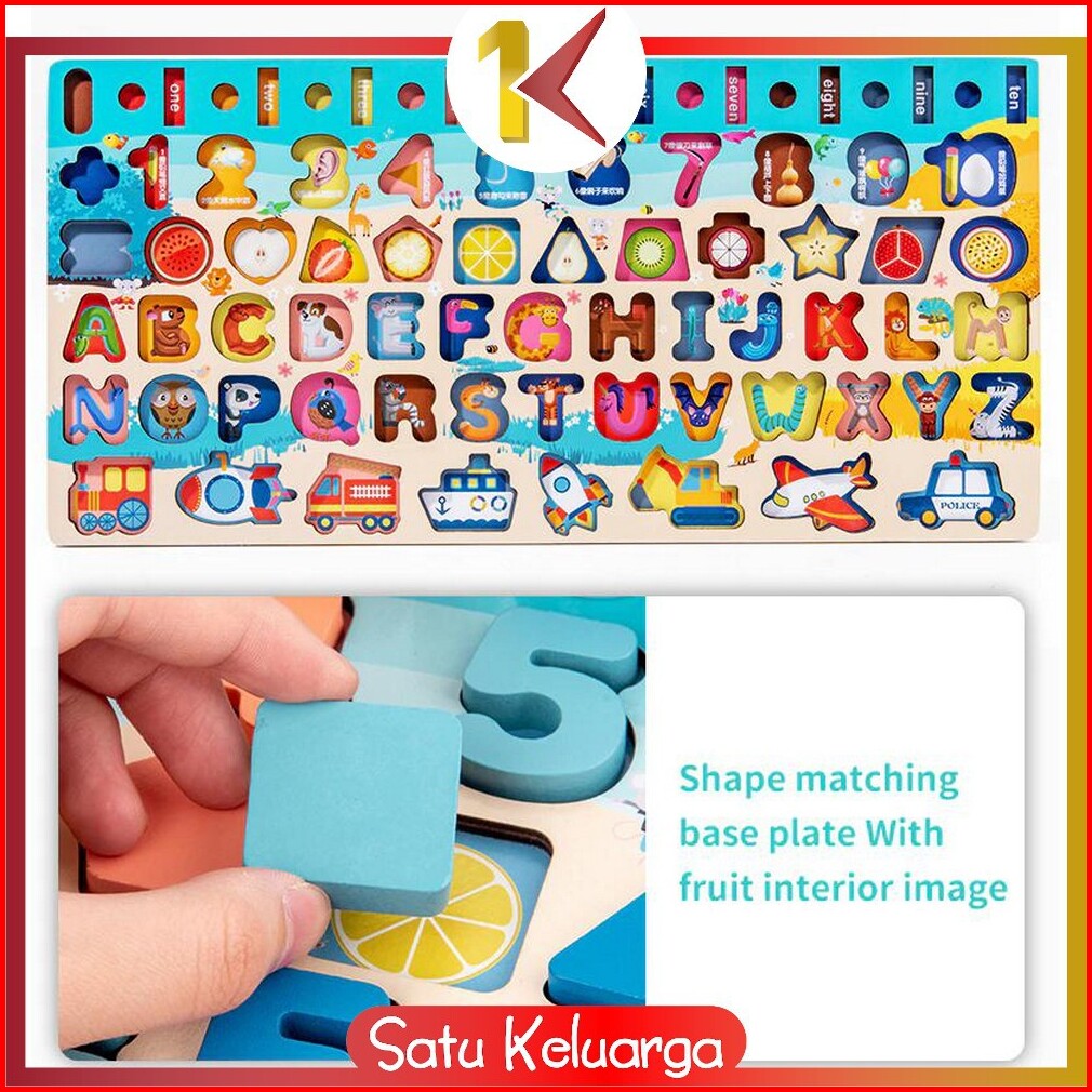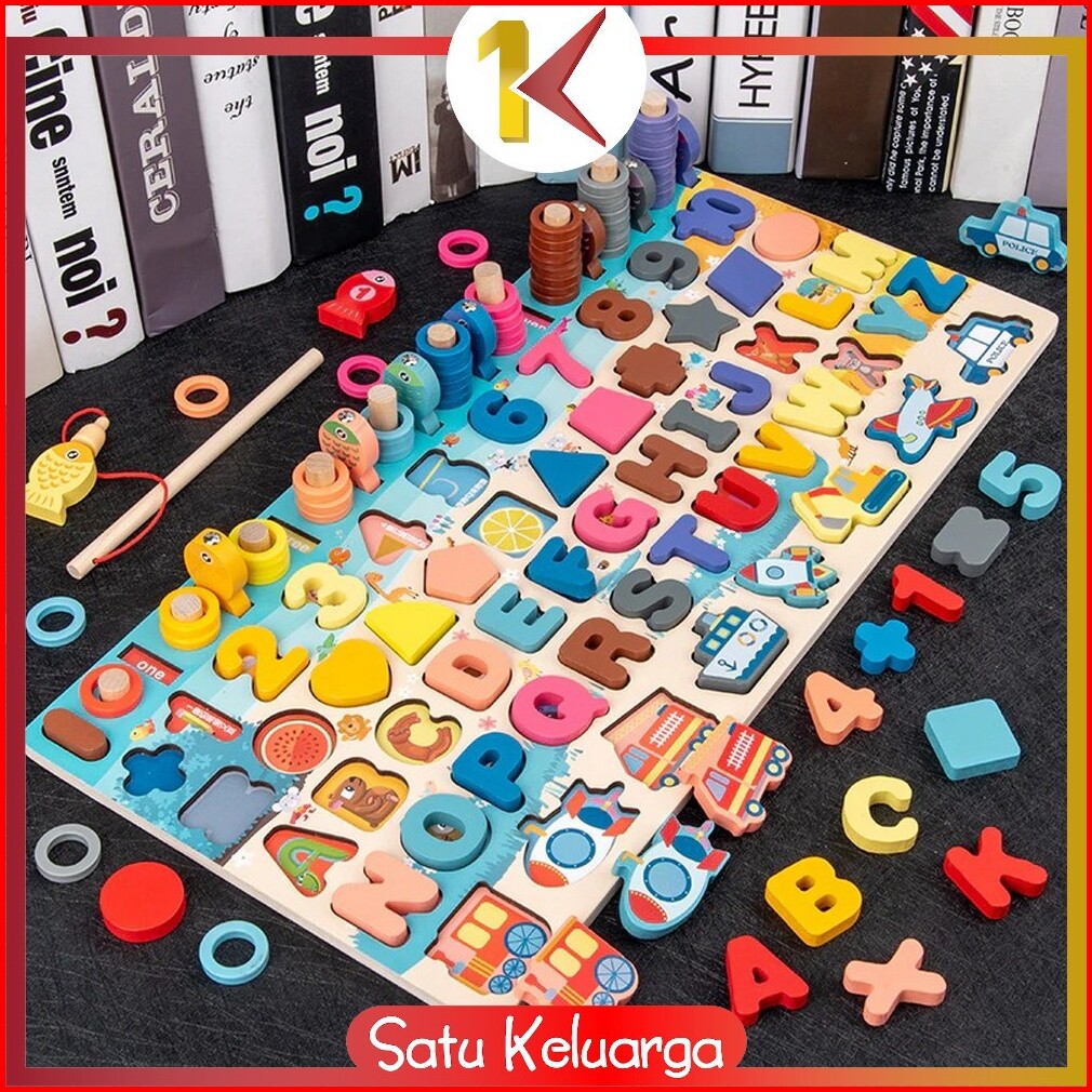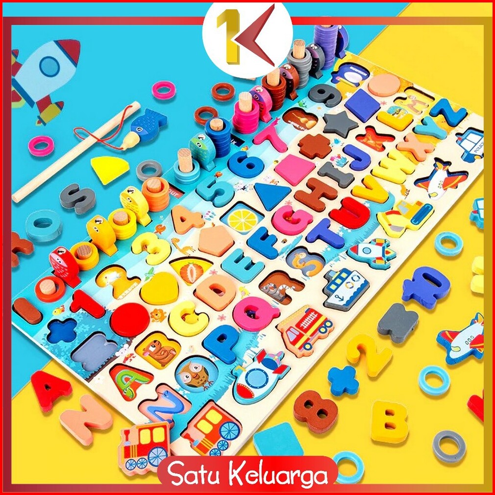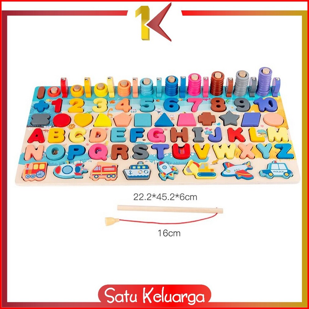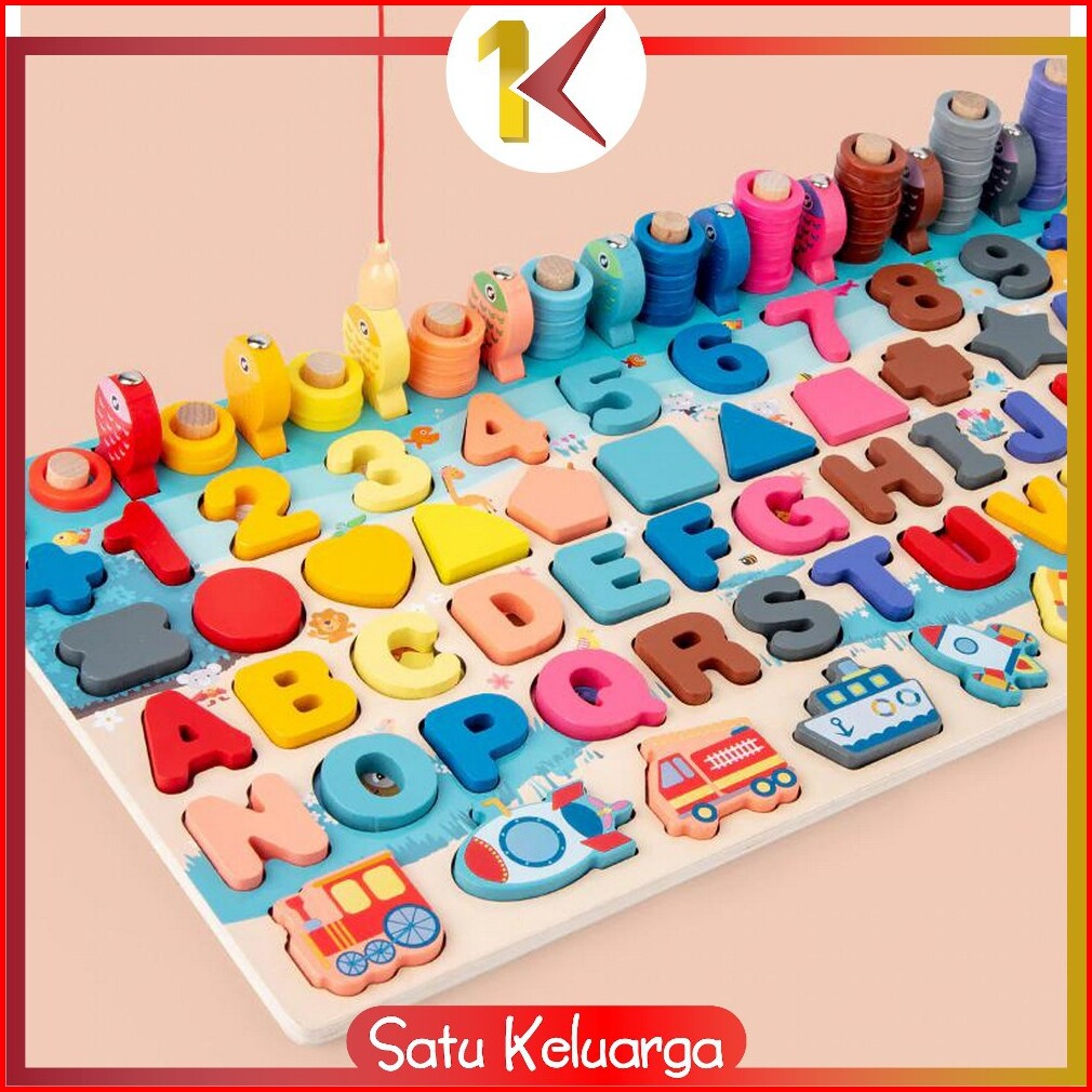 Sk-m94 Mainan Edukasi 7in1 Puzzle Kayu Anak Huruf Dan Angka Pancing Ikan Montessori Wooden Toys