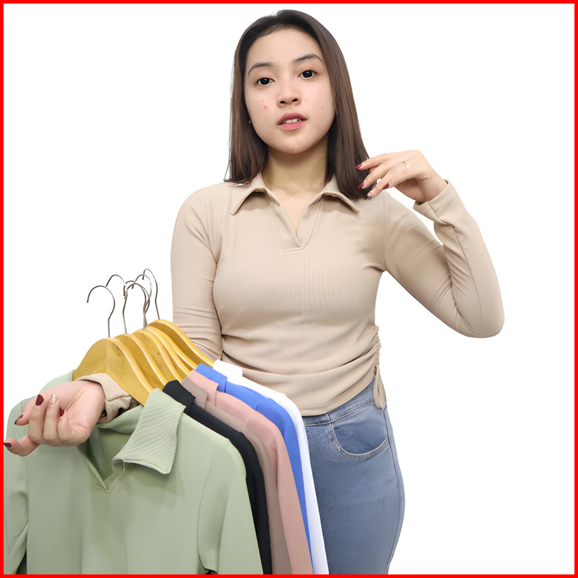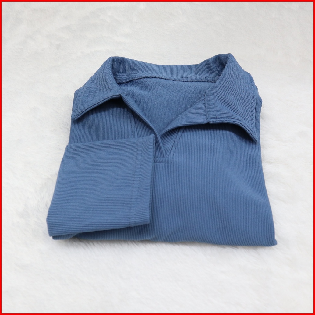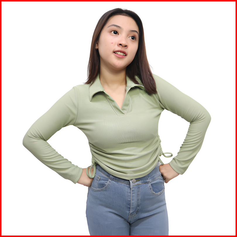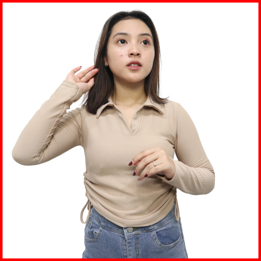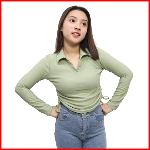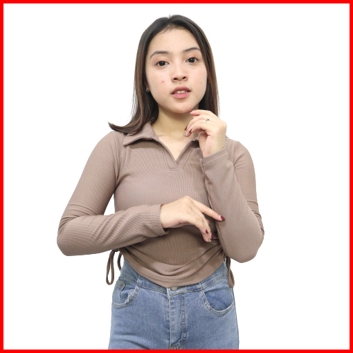 Atasan Kerah Crop Tali Serut Samping Kaos Berkerah Vneck Lengan Panjang Wanita Style Korea