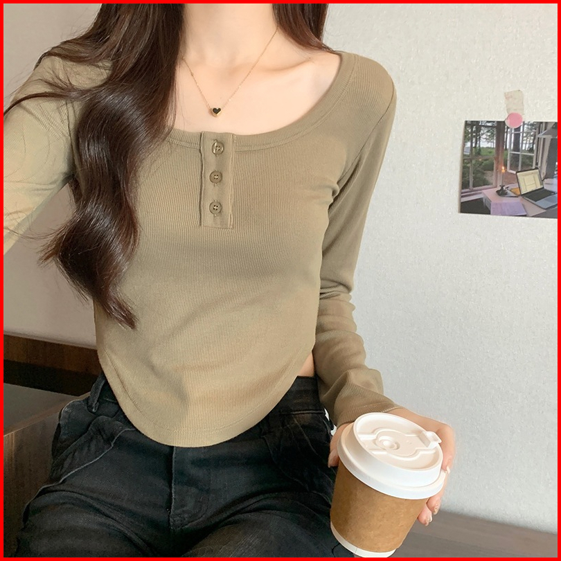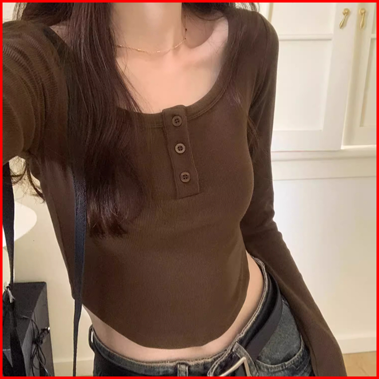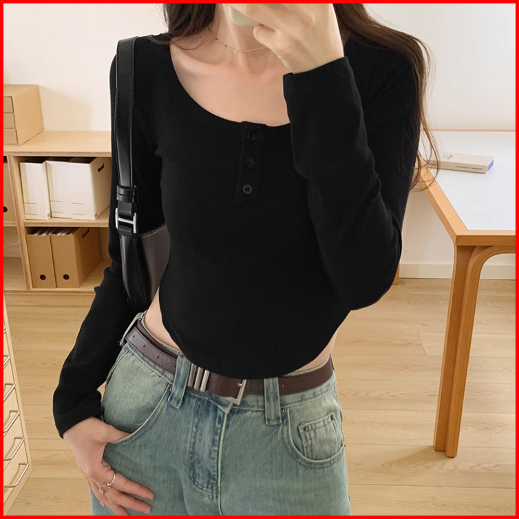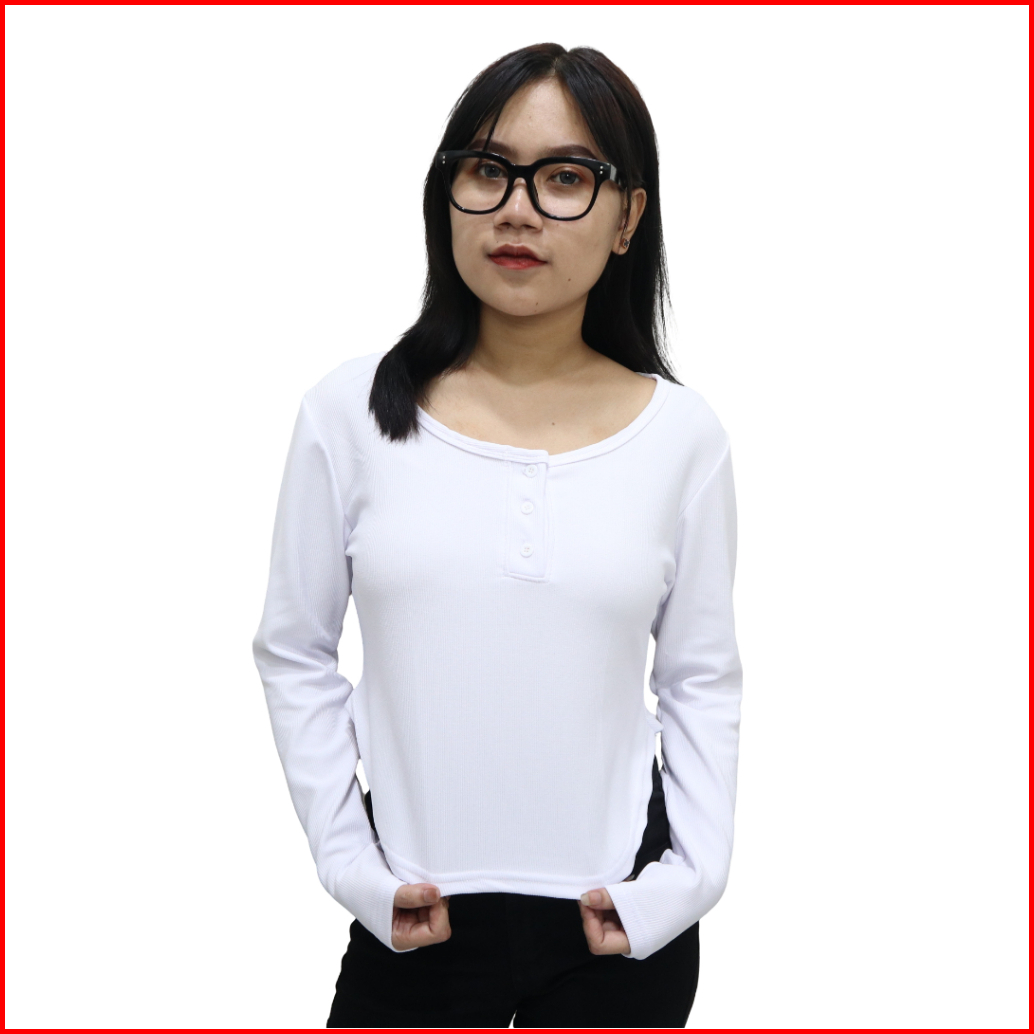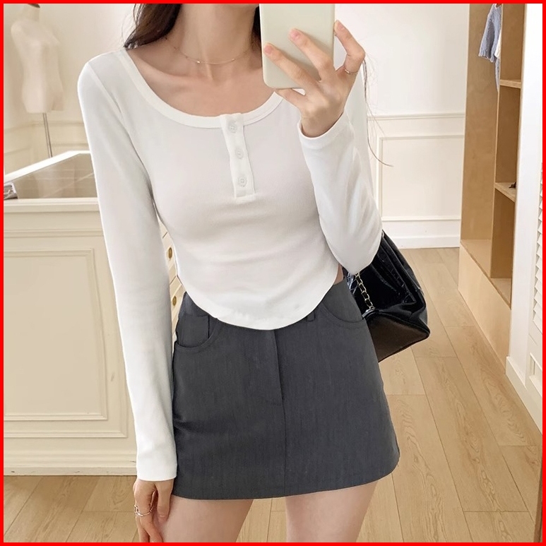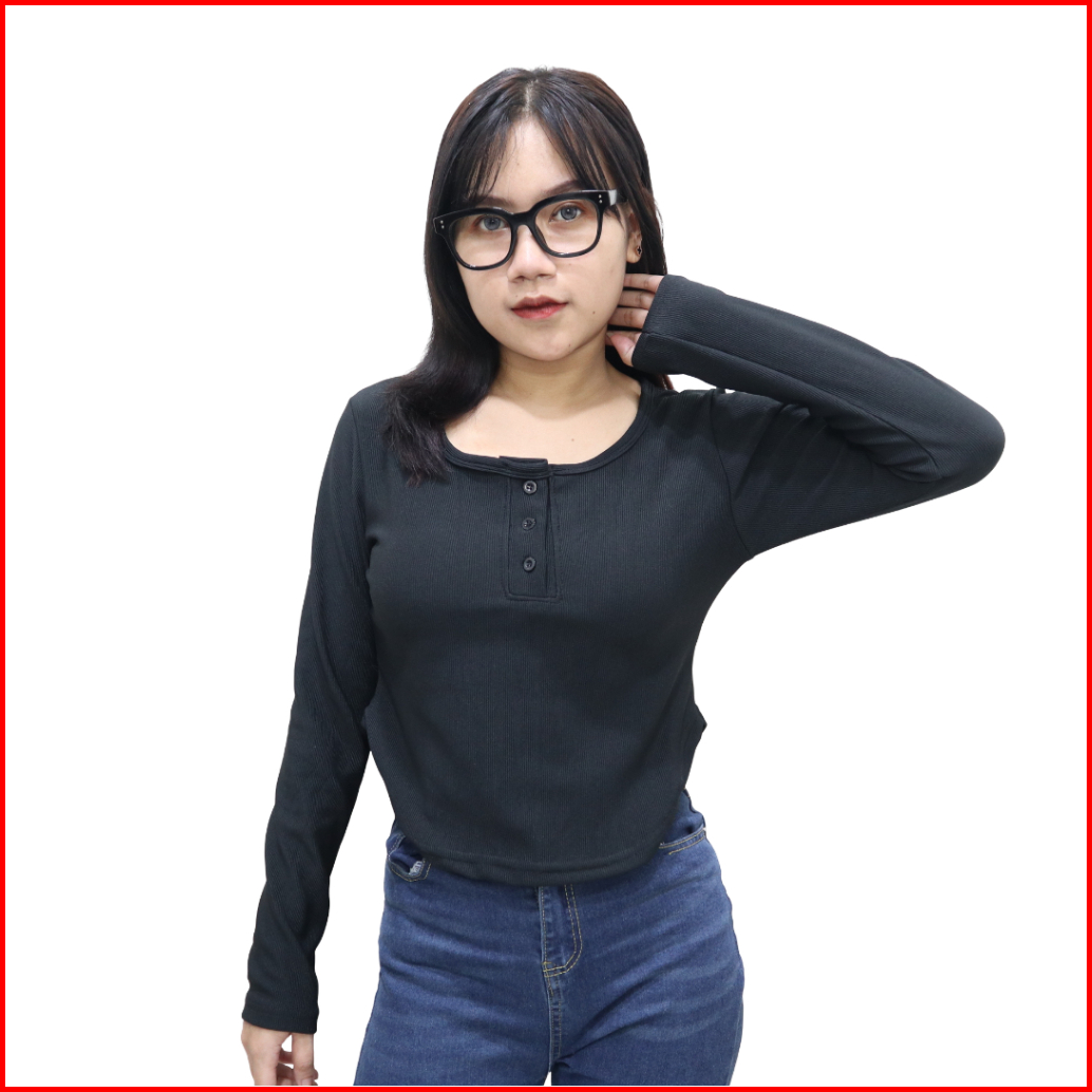 Kaos Wanita Lengan Panjang Knit Blouse Wanita Premium Atasan Crop Slit Button Style Korea